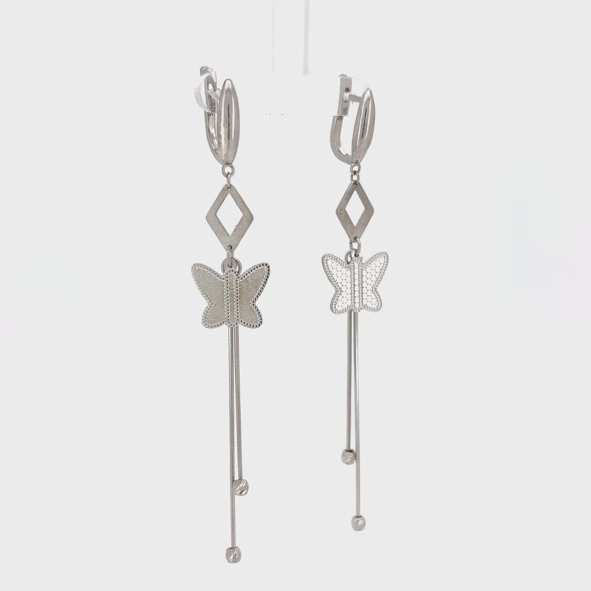 Adorn your ears with the captivating elegance of our Butterfly Drop Earrings. Expertly crafted from 925 Sterling Silver, these sophisticated earrings feature a comfortable lever-back closure. A sleek, polished elongated diamond shape descends, leading to a beautifully detailed butterfly motif. One wing of the butterfly boasts a smooth, radiant silver finish, while the other features an intricate, subtly textured pattern, creating a delicate contrast. From the butterfly, slender chains gracefully cascade, ending with tiny silver beads that add a subtle movement and shimmer.