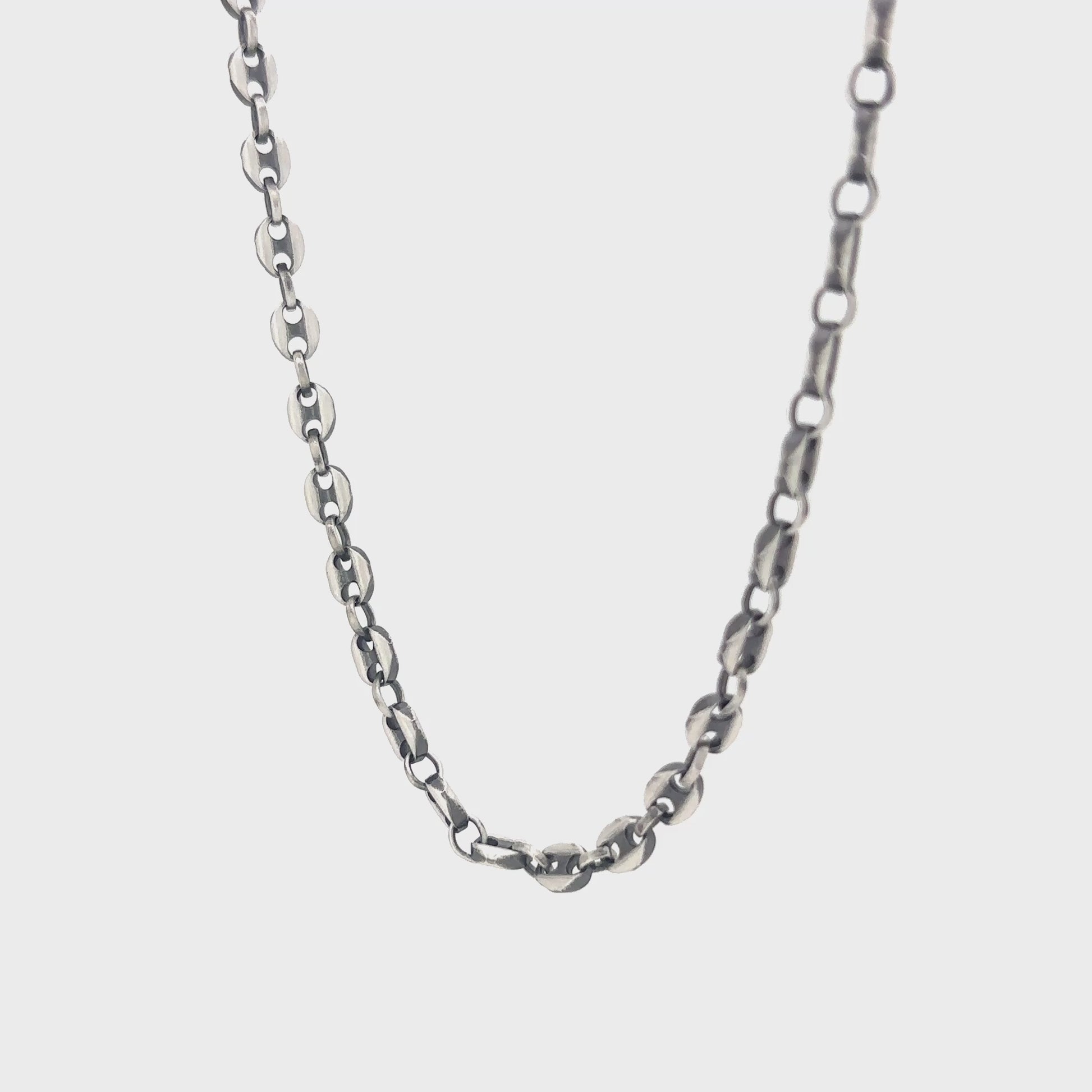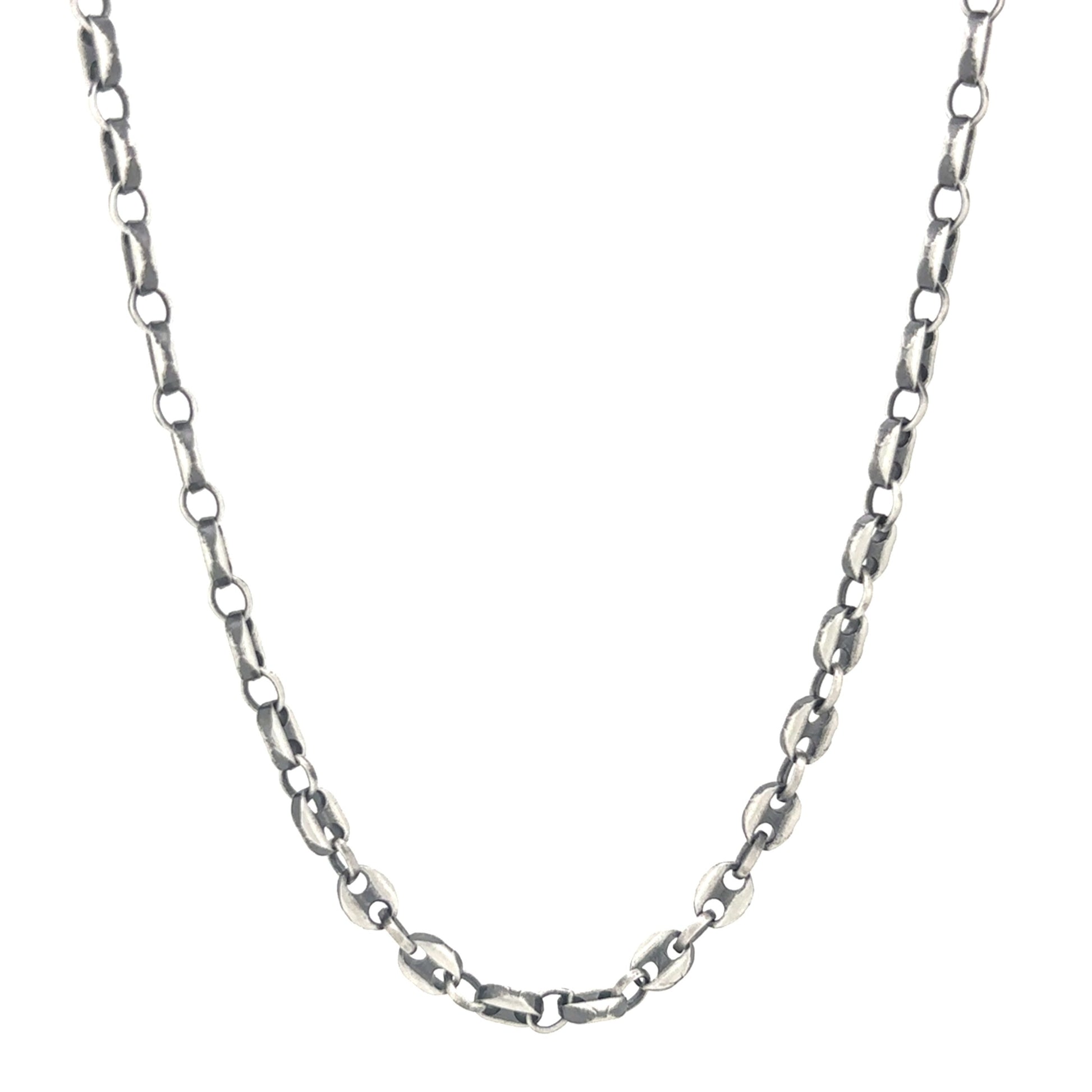 This substantial silver chain features a unique and intricate link design. Each individual link is thick and polished, giving the necklace a luxurious and weighty feel that speaks to its quality. The surface of the links is a mix of smooth and textured finishes, allowing it to catch and reflect light for a truly dynamic look. Its robust construction ensures it is both a stylish accessory and a durable piece for daily wear.
