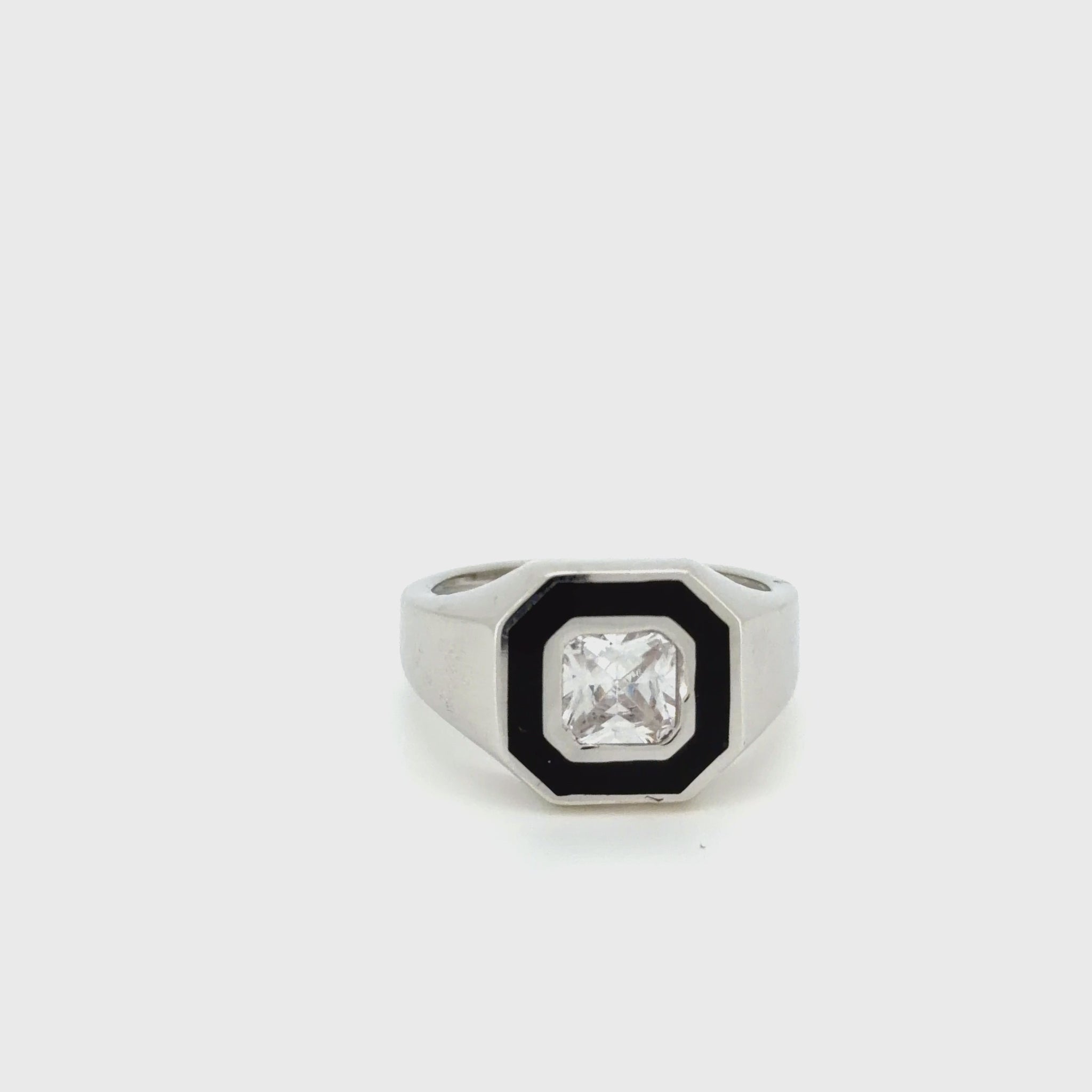 Wear it as a standalone statement piece. Let it do the talking.This distinctive ring is perfect for making a confident statement in both formal and smart-casual settings. Its bold design and classic color palette make it an excellent standalone accessory, complementing a tailored suit, a crisp dress shirt, or even adding a touch of refinement to a dark denim look. Ideal for the man who values unique style and timeless elegance.This bold men’s silver ring pairs best when it’s the only statement accessory. Let the black enamel contrast  complement darker tones — charcoal, navy, black, deep brown. If you wear confidence well, this ring will follow naturally.