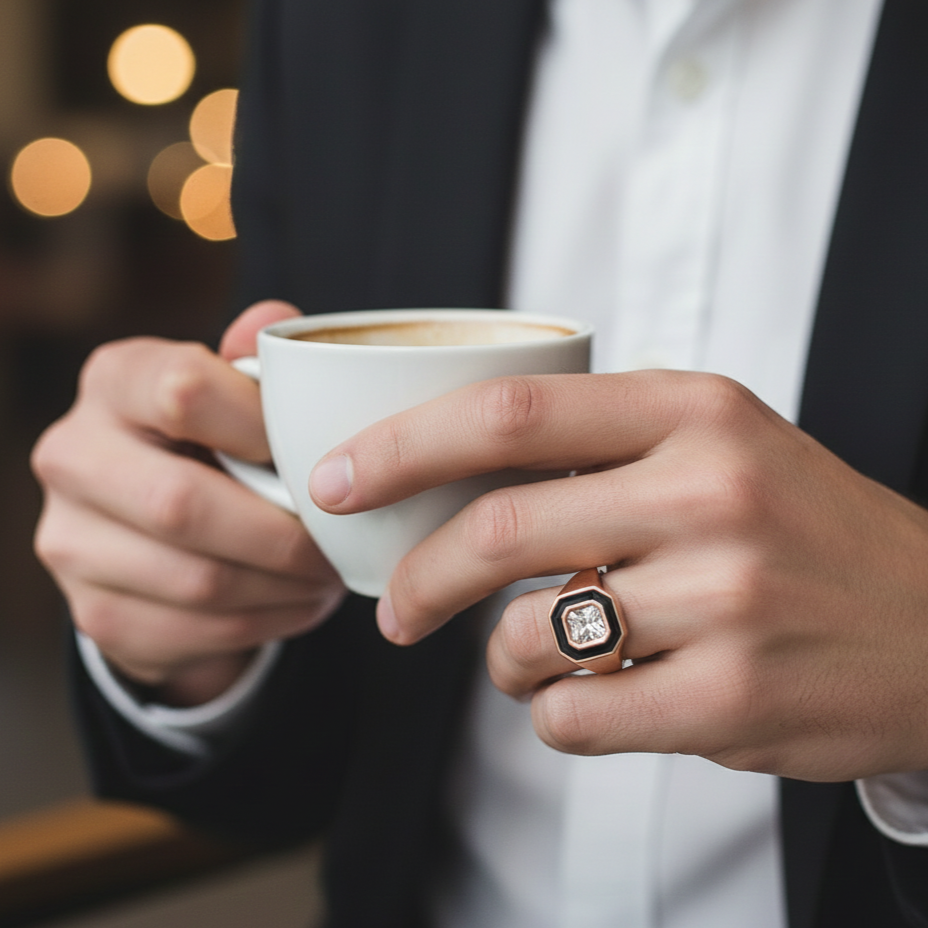 The geometric precision of the octagonal top gives it a strong masculine identity. The black enamel adds depth and drama. And the square zircon catches light beautifully, offering a luxurious sparkle without being flashy.