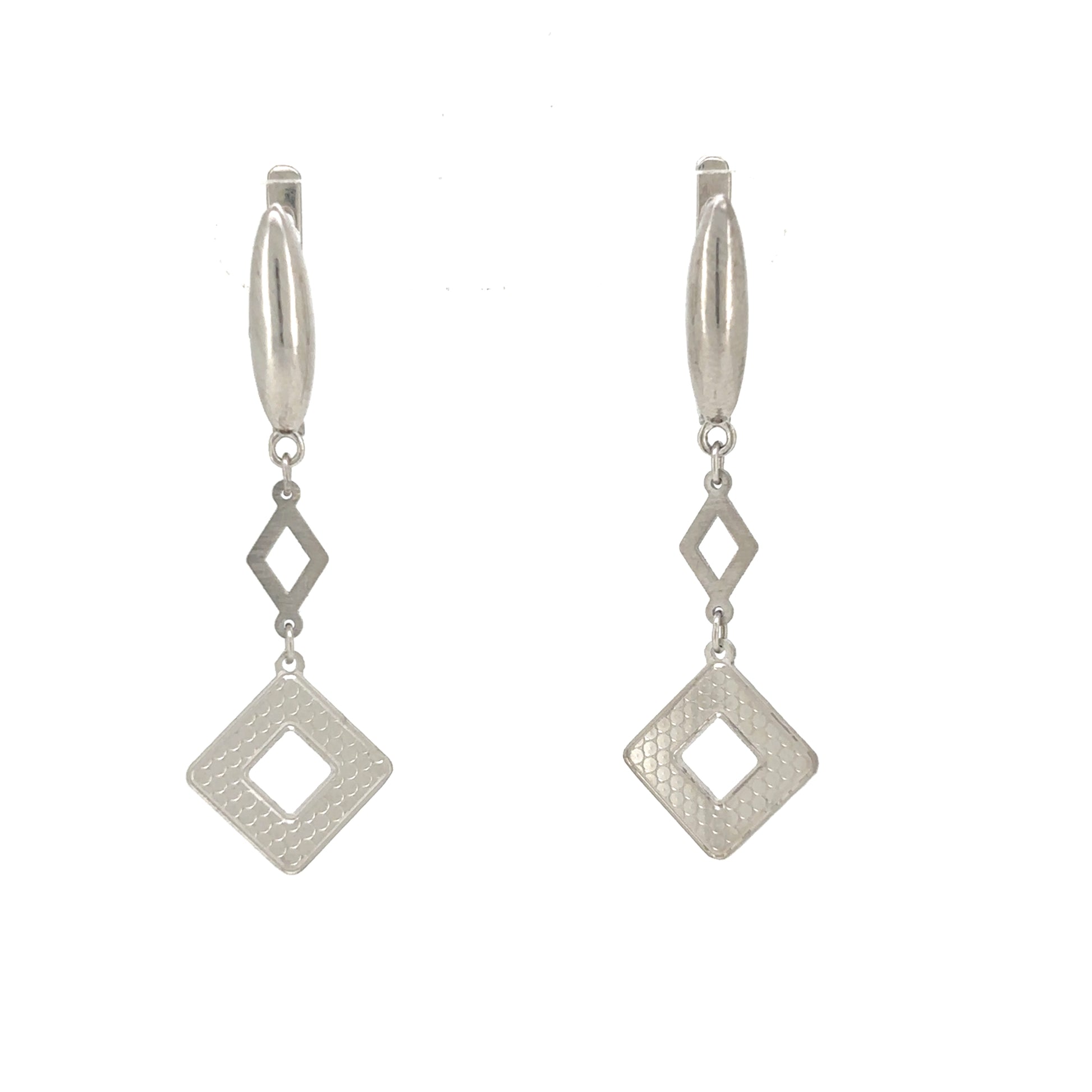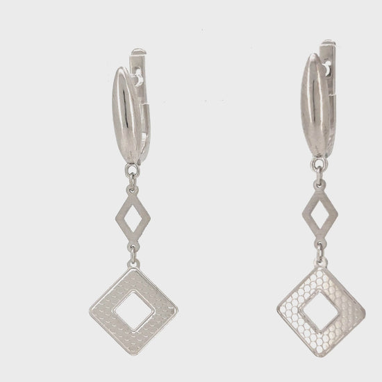 Adorn your ears with the captivating allure of our Geometric Cascade Drop Earrings. Expertly crafted from 925 Sterling Silver, these elegant earrings feature a comfortable lever-back closure. A sleek, polished elongated diamond shape descends, leading to another, larger diamond-shaped open motif. This larger element boasts a subtle, intricate textured pattern, creating a refined visual contrast with the smooth silver. The layered geometric forms create an eye-catching dangle, shimmering with every turn.