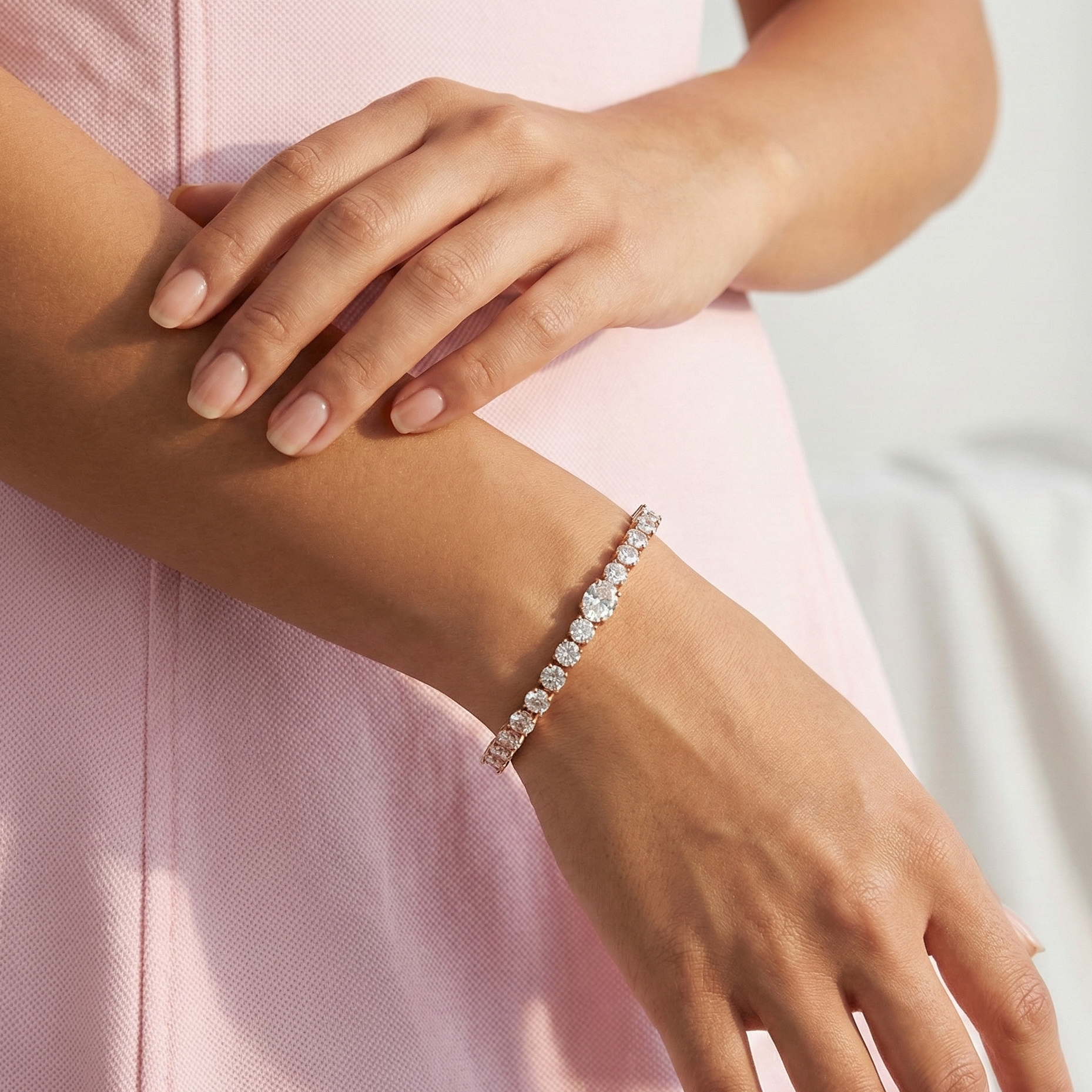 This magnificent rose gold and diamond tennis bracelet is perfect for adding unparalleled glamour and sophisticated sparkle to any occasion. Ideal for formal events, anniversaries, or whenever you desire a piece that truly exudes luxury, it pairs beautifully with evening gowns, cocktail dresses, or can elevate a chic business ensemble. Its dazzling design makes it a show-stopping standalone piece or a luxurious complement to other rose gold and diamond jewelry.