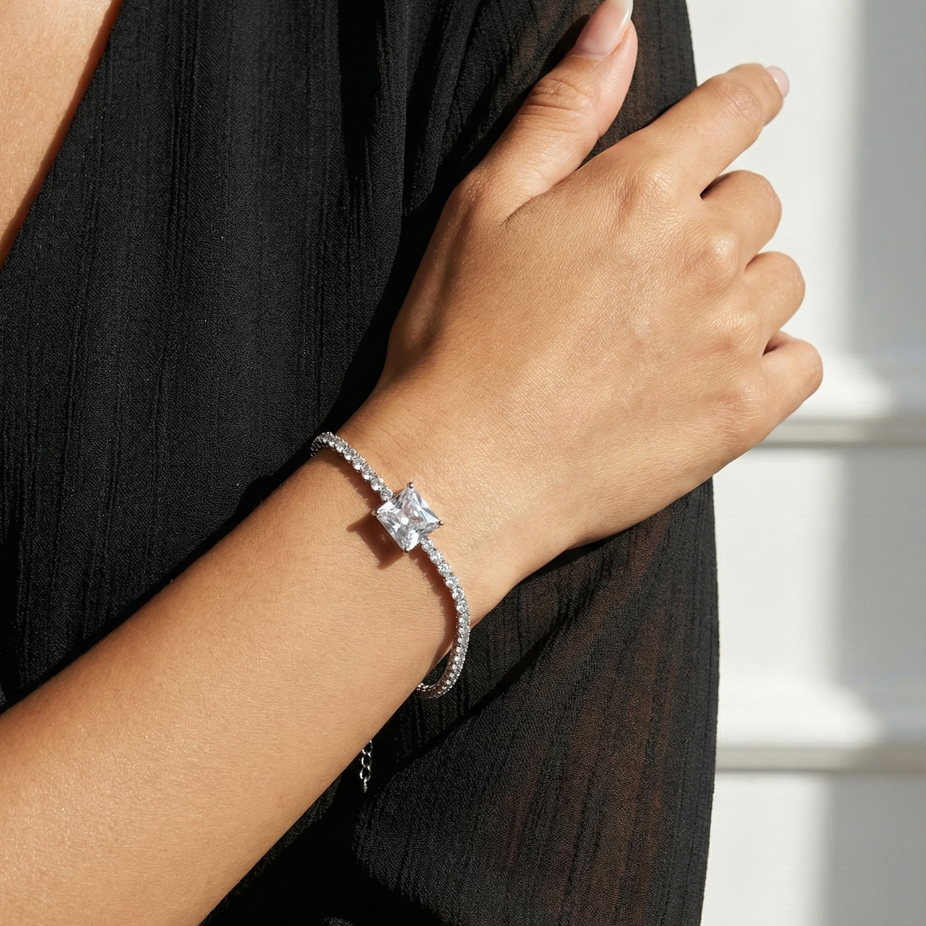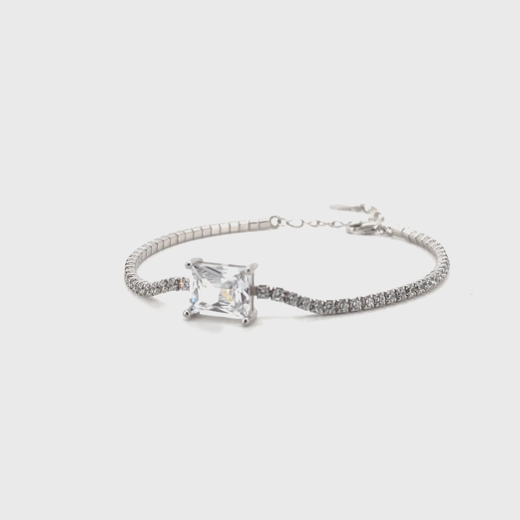 Adorn your wrist with the breathtaking brilliance of our Radiant Regent Tennis Bracelet. Expertly crafted from 925 Sterling Silver, this exquisite bracelet features a continuous line of perfectly matched, high-quality simulated diamonds, creating an uninterrupted band of dazzling light. At its center, a magnificent, prominent square-cut (emerald cut) simulated diamond takes pride of place, offering a captivating focal point with its exceptional clarity and sparkle. This stunning centerpiece is seamlessly integrated into the flexible diamond chain, ensuring maximum comfort and continuous radiance.