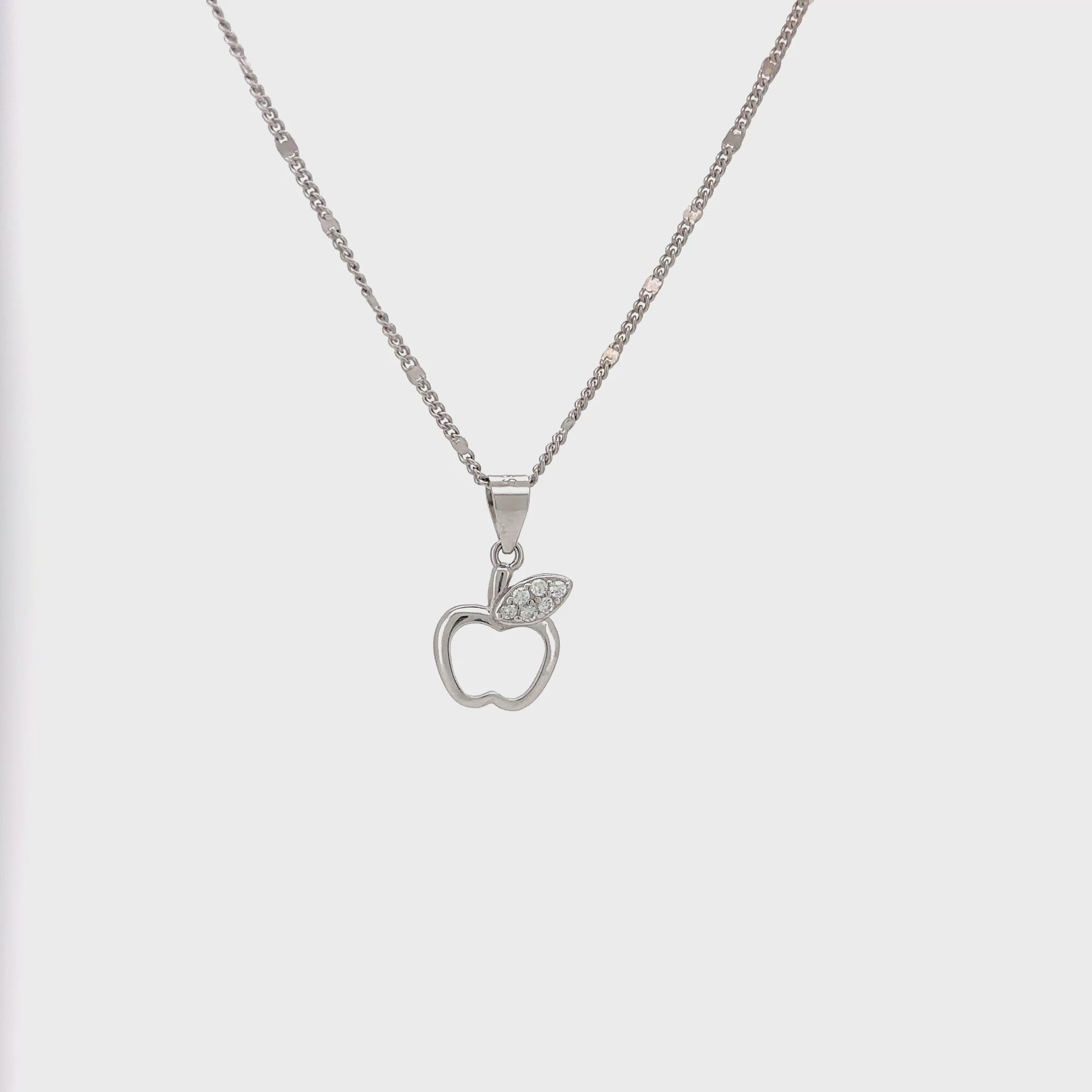 This delightful silver necklace features a beautifully crafted apple-shaped pendant. The body of the apple is a smooth, polished white material that gives it a clean and luminous finish. The top of the apple is adorned with a detailed silver stem and a single, stylized leaf, which is completely encrusted with a pave of brilliant zircons for a captivating sparkle.