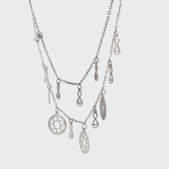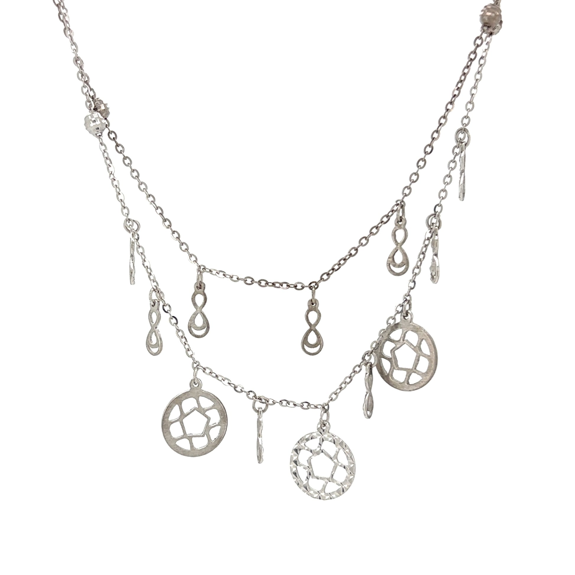 This sophisticated necklace features a two-layer design with distinct yet complementary chains. The top layer is a delicate chain adorned with small, polished silver infinity charms spaced at intervals. The bottom layer showcases two striking circular pendants with an intricate geometric, grid-like pattern. Both chains are accentuated by delicate, polished S-shaped dangles that gracefully hang, adding beautiful movement and a captivating allure to the necklace.