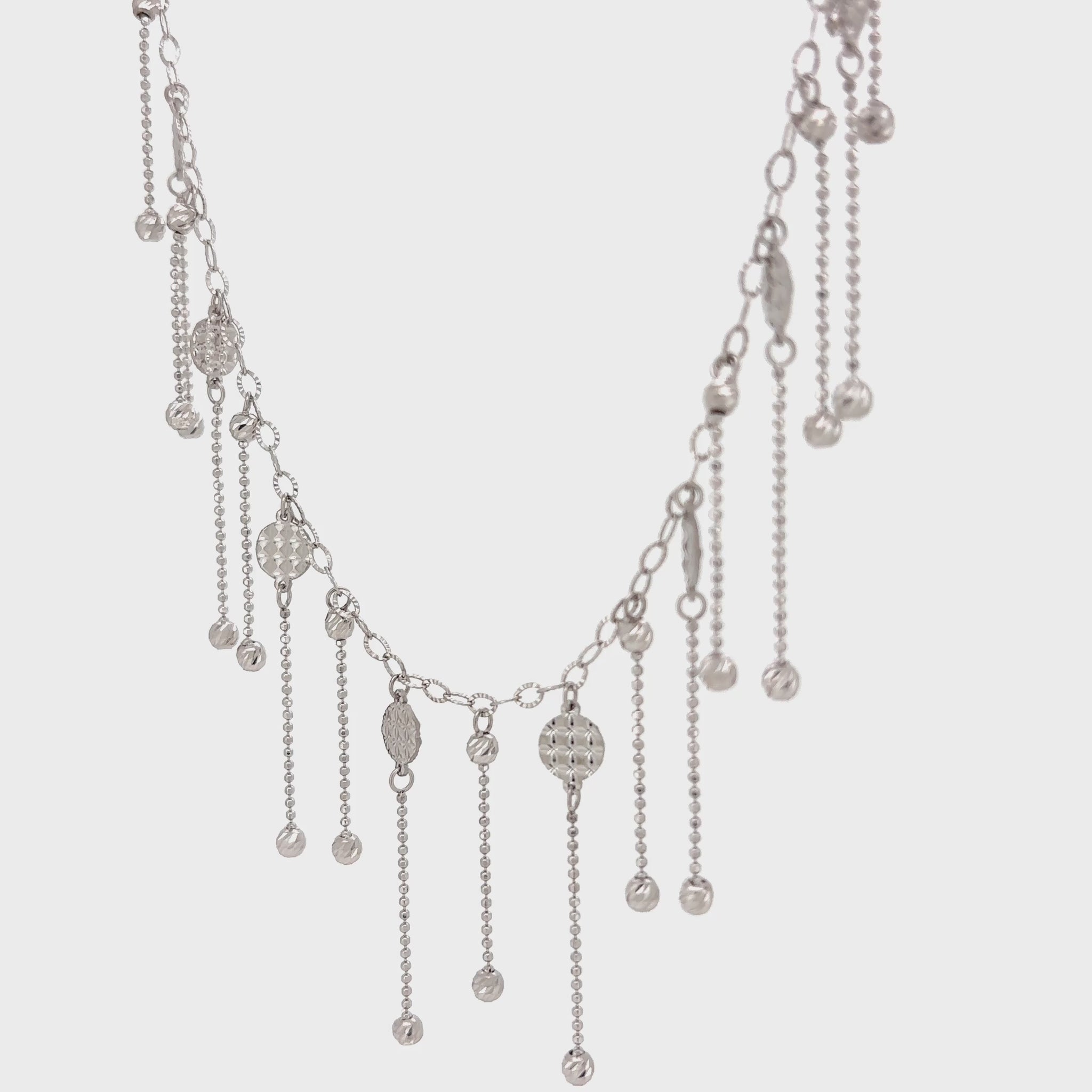 This striking necklace is a decorative chain with a unique festoon-like design. Along its length, the chain features small, ornate motifs from which delicate chains hang down. Each of these dangles is finished with a small, polished silver ball, creating a beautiful fringe effect that moves and catches the light with every turn.