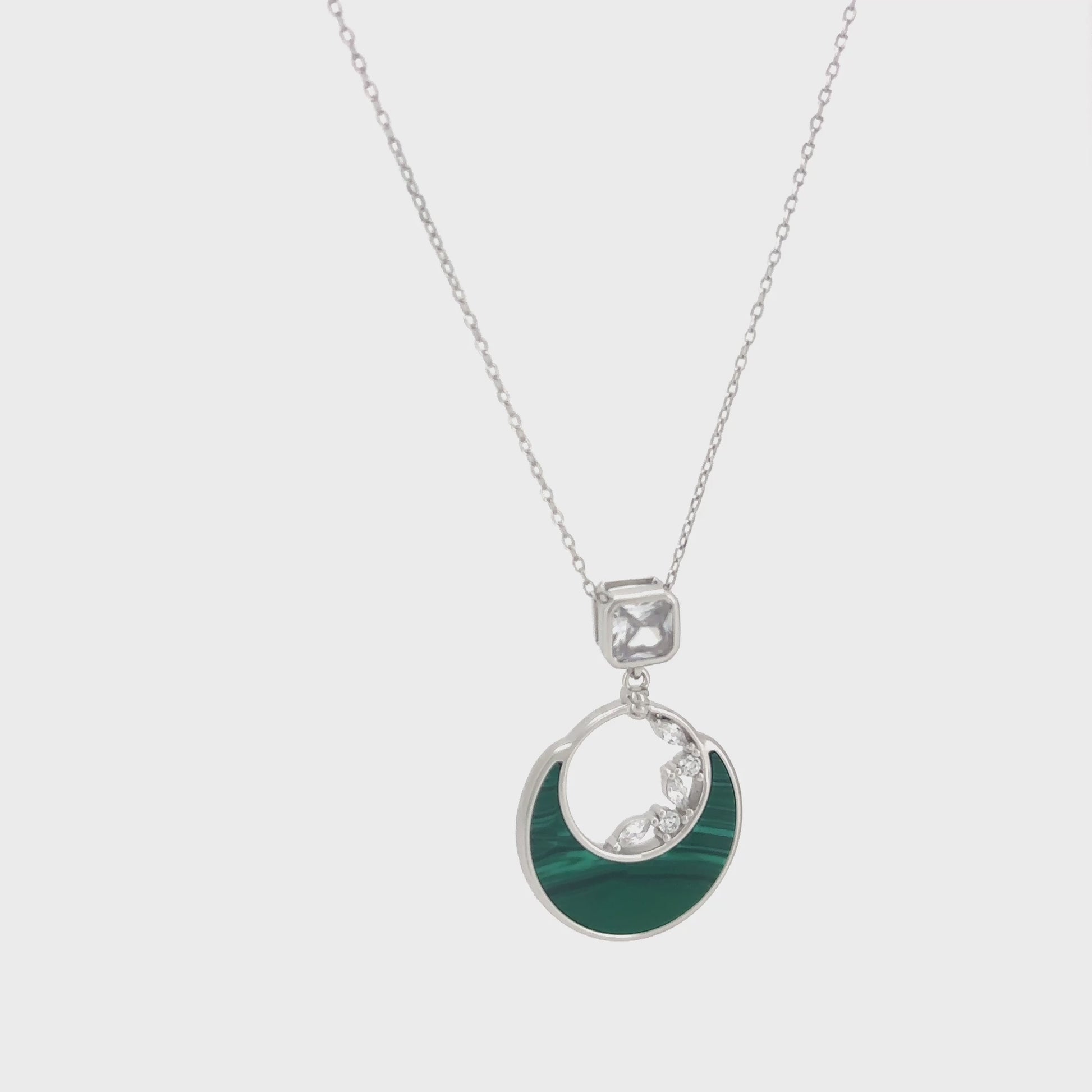 This captivating silver necklace features a unique pendant with a graceful half-moon shape. The crescent is filled with a vibrant, deep green enamel, creating a bold contrast against the polished silver. The pendant is suspended from the chain by a brilliant, sparkling zircon, adding a touch of radiance to the design.