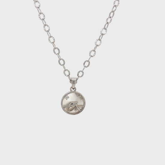 This elegant necklace features a beautifully crafted circular pendant with a graceful dolphin figure at its center. The circle is filled with a piece of iridescent Mother of Pearl, creating a shimmering, oceanic backdrop for the design. The dolphin is a polished silver detail, creating a beautiful contrast and capturing a sense of fluid motion. This piece is a true testament to the beauty of nature and the artistry of fine jewelry.