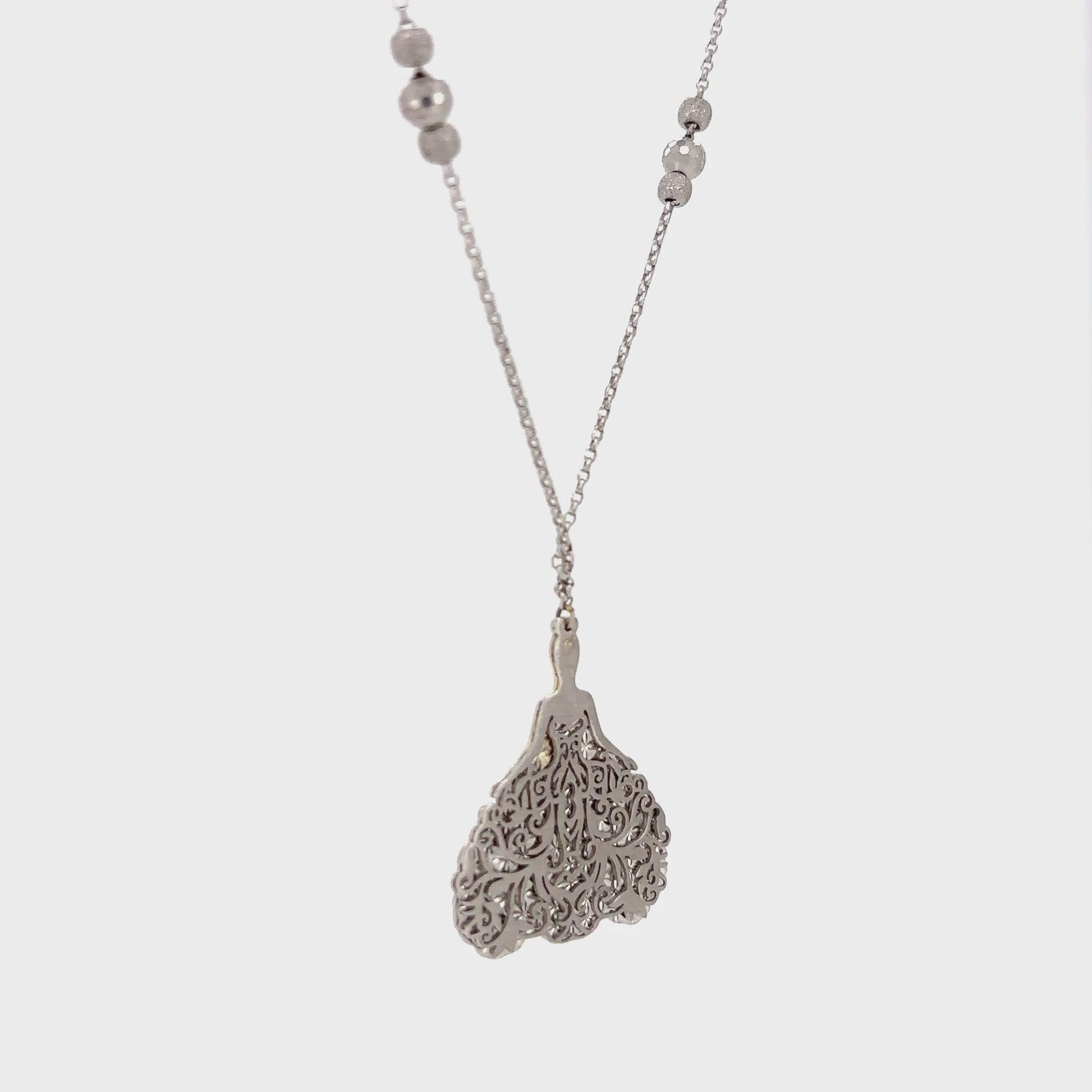 This whimsical necklace features a delicate pendant of a girl wearing a beautiful gown, giving her the look of a fairytale princess. The charm is suspended from a polished link chain which is adorned with small, brilliant silver balls spaced at intervals, adding a touch of subtle sparkle