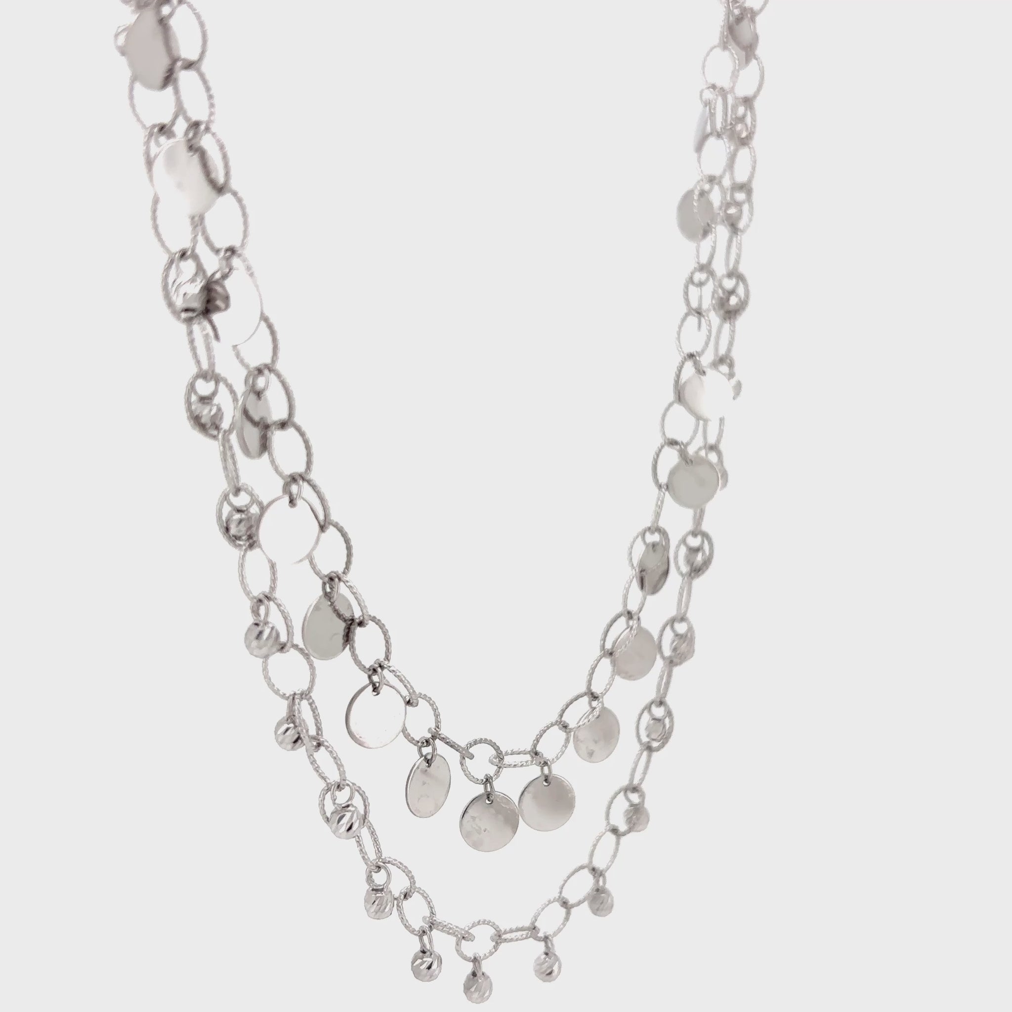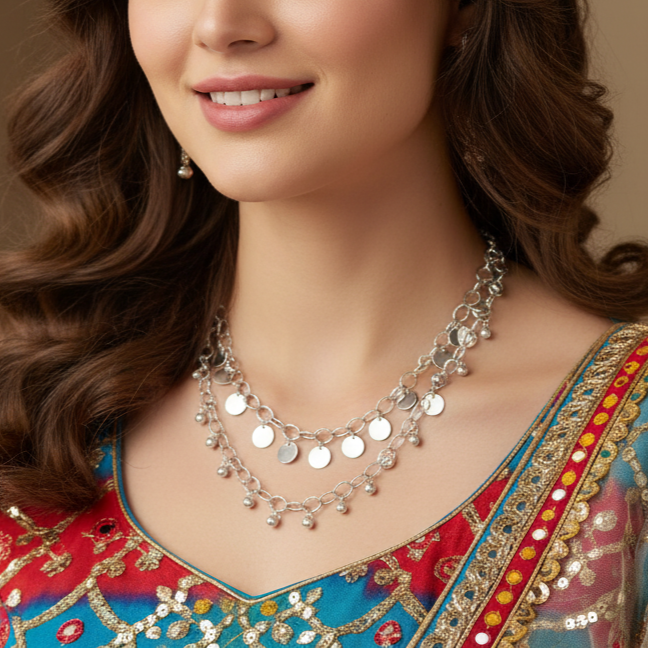 A masterpiece of movement, this layered silver-toned necklace is the ultimate festive statement piece. It features a cascading double-strand design that mimics the beautiful flow of traditional Indian jewelry with a contemporary twist.Adorned with polished silver discs and textured "Ghungroo-style" beads, it creates a subtle, melodic visual sparkle as you move.While it’s born for the dance floor, its sophisticated "sequin" charms make it equally stunning for Diwali parties or festive family gatherings.