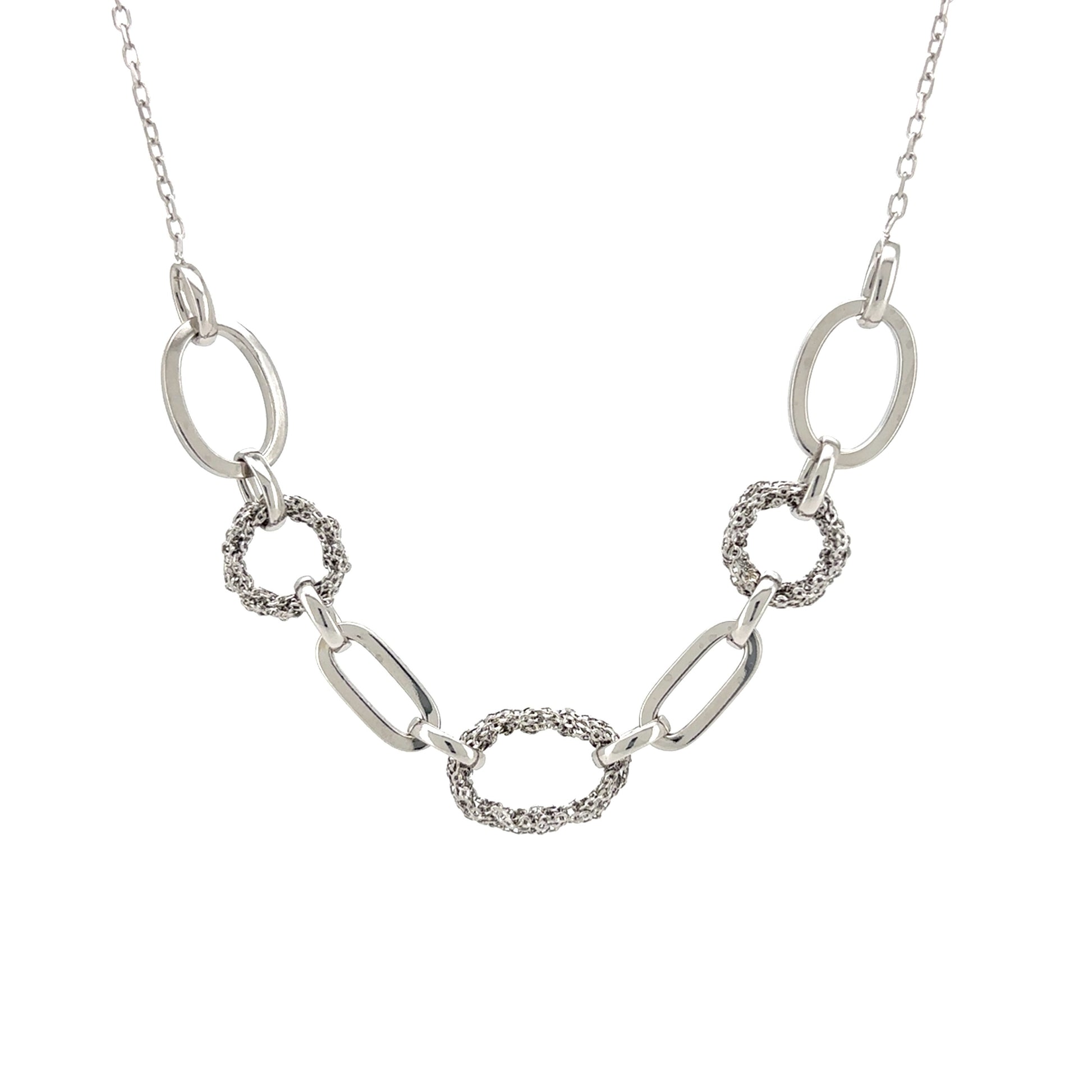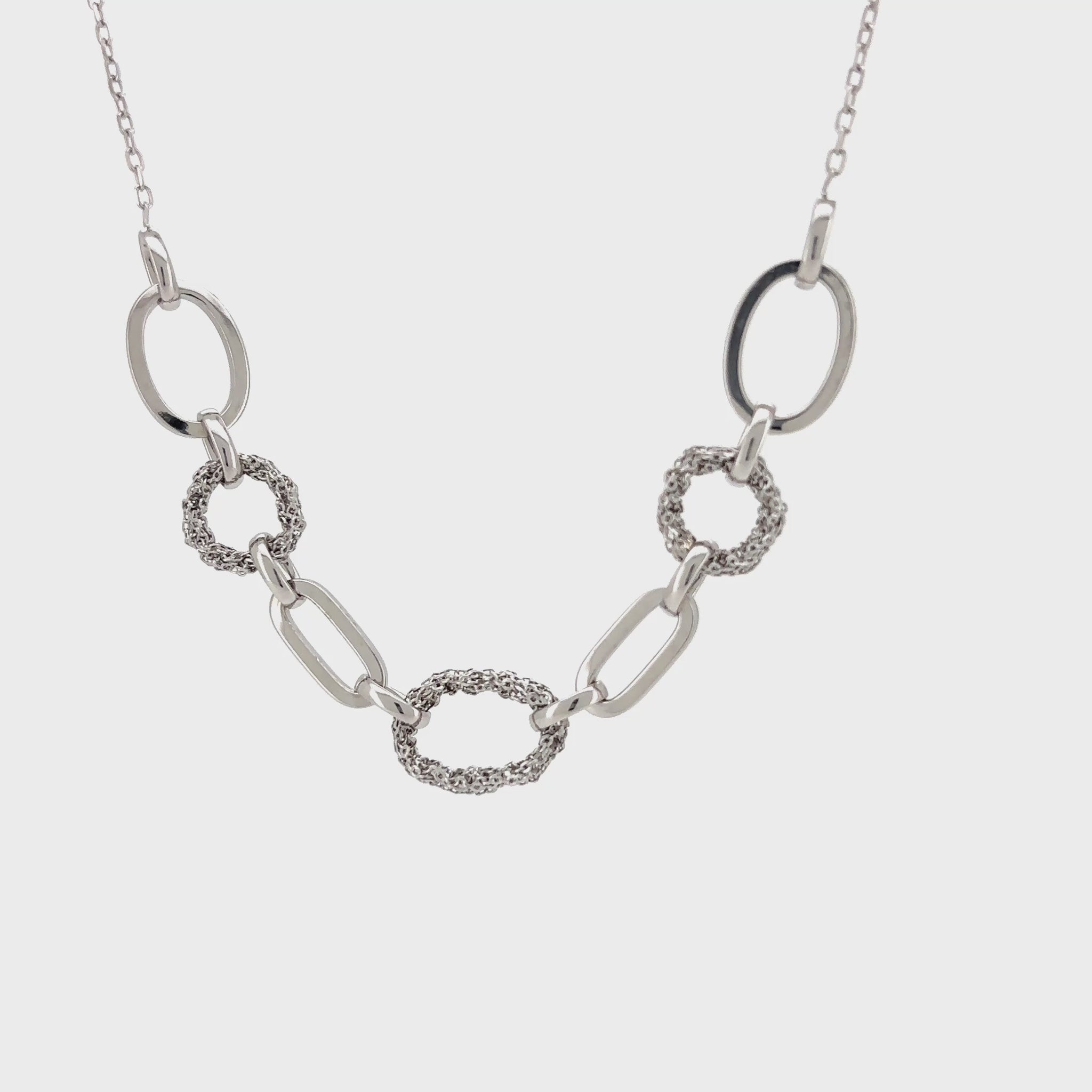 This sophisticated silver necklace features a series of beautifully crafted, interconnected oval links. The chain is designed with a striking contrast: some of the links are a simple, high-polish silver, while others are entirely textured, creating a stunning interplay of shine and finish. This unique design makes it a standout piece for any occasion.