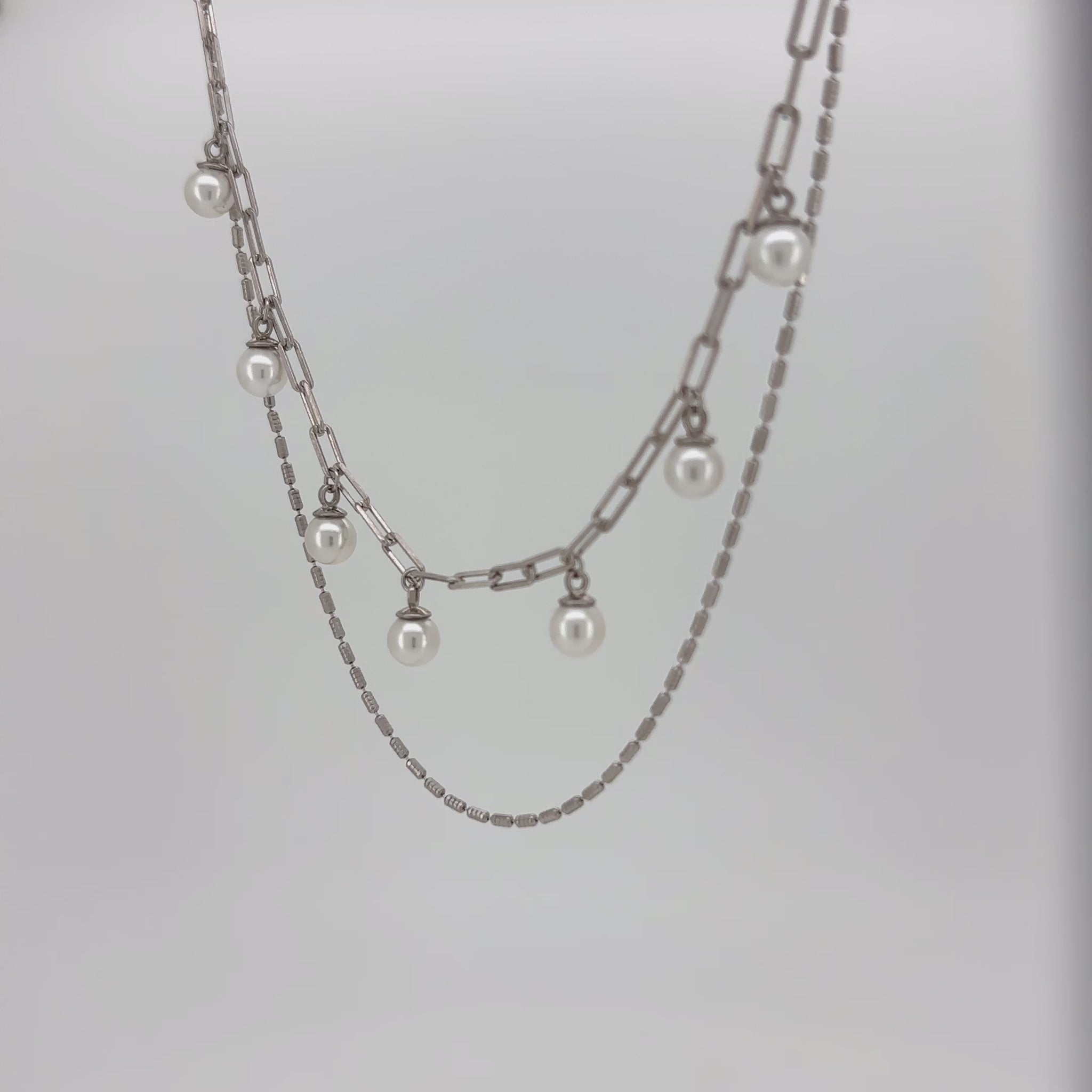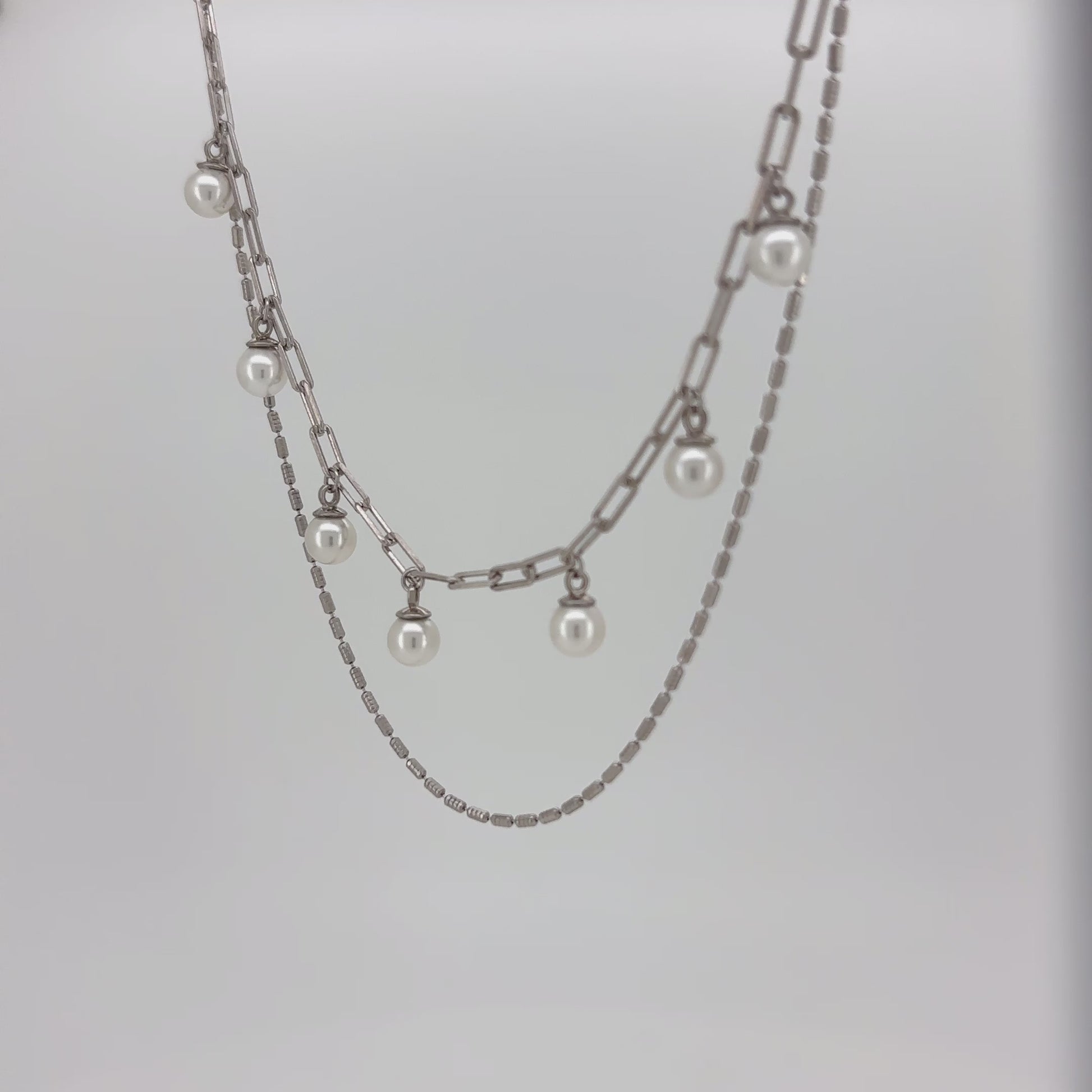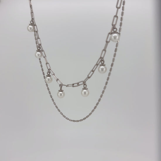 This elegant necklace features a perfectly styled, two-layer design that creates an instant statement. The top layer is a sleek, polished link chain, while the bottom layer is a delicate chain with multiple dangling white pearls, adding a classic and sophisticated touch. The two chains are seamlessly connected to provide a complete and polished layered style.