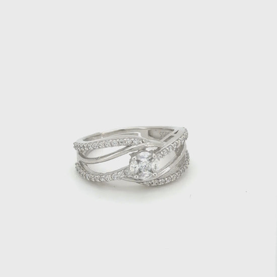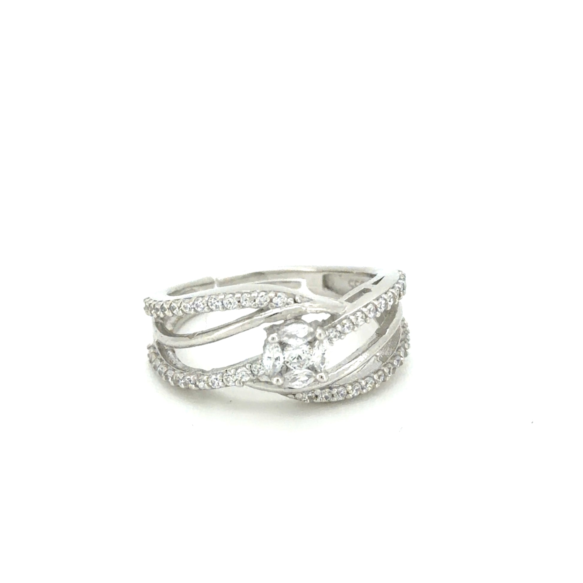 This exquisite silver ring features a captivating central round-cut zircon, beautifully set to maximize its brilliance and shine. The band design is a striking split-shank, crossover style, with multiple slender ribbons of silver elegantly intertwining. Each of these intricate silver ribbons is meticulously pave-set with brilliant white zircons, creating a continuous cascade of sparkle around the central stone. The layered design gives it a rich, luxurious feel while maintaining an ethereal lightness.