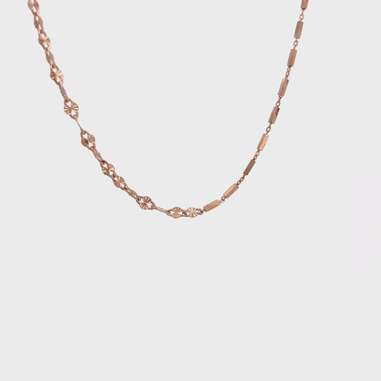 This elegant silver necklace features a captivating dual-style chain. One half of the chain is a series of polished, elongated bar links, giving it a sleek and contemporary feel. The other half is composed of intricate, faceted links that catch the light beautifully, adding a touch of classic sparkle. This unique combination creates a fluid, two-sided design that is both modern and effortlessly chic.