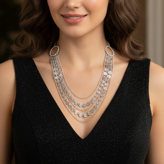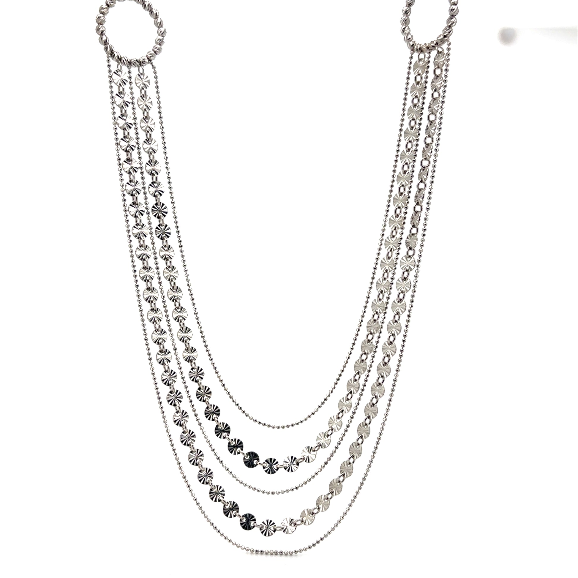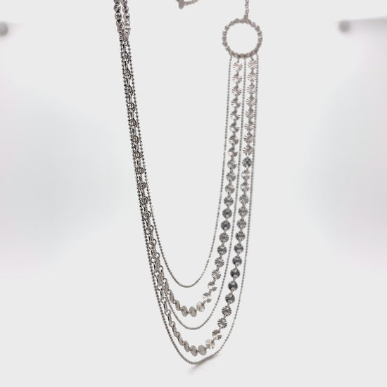 This stunning necklace features a beautiful multi-strand, layered design. The main chain is adorned with two large, circular motifs on either side, which are composed of tiny, brilliant silver balls. From these circular elements, several individual chains cascade downwards, each with its own unique pattern, including chains with small and medium-sized silver beads or circles. This combination of layers and textures creates a luxurious, waterfall-like effect.