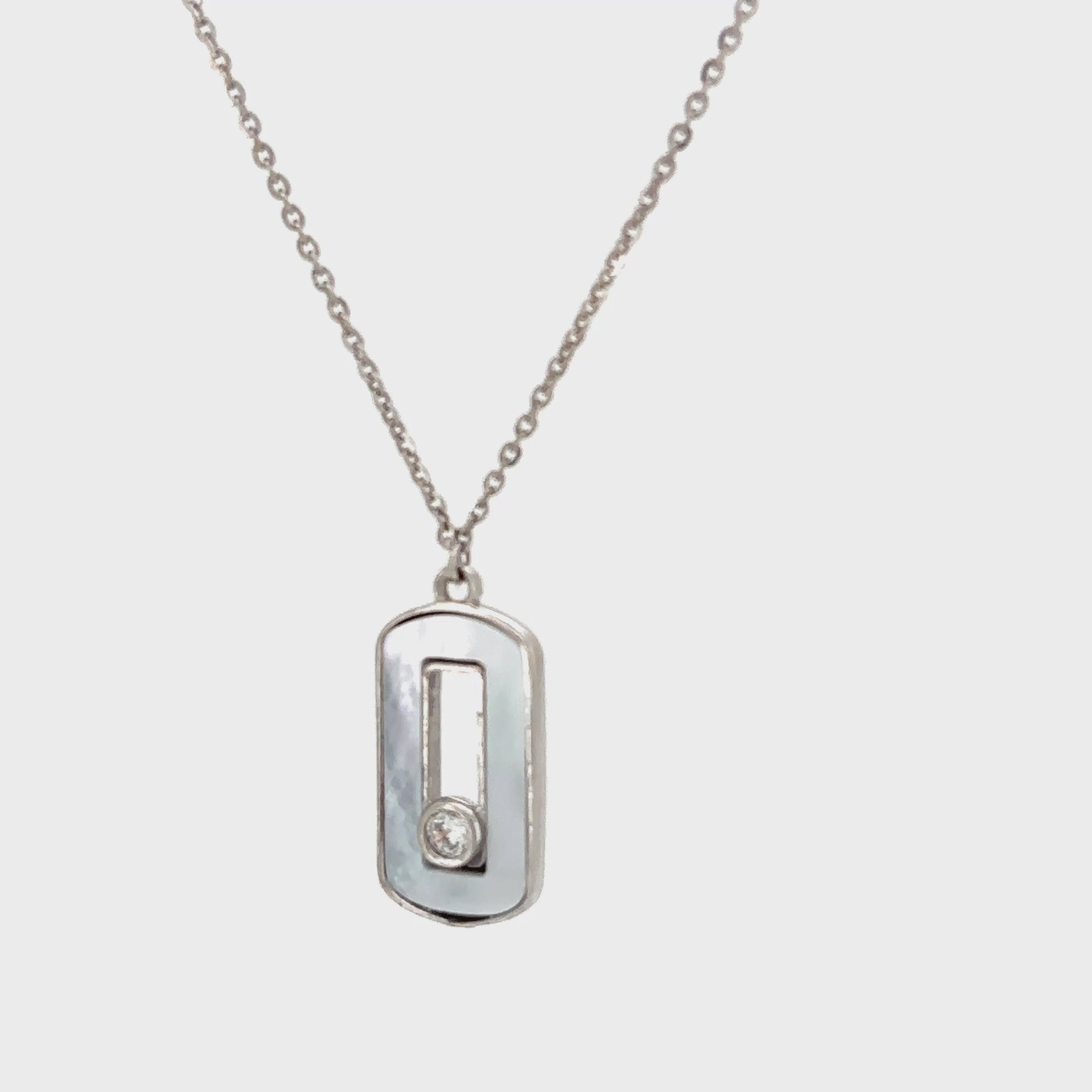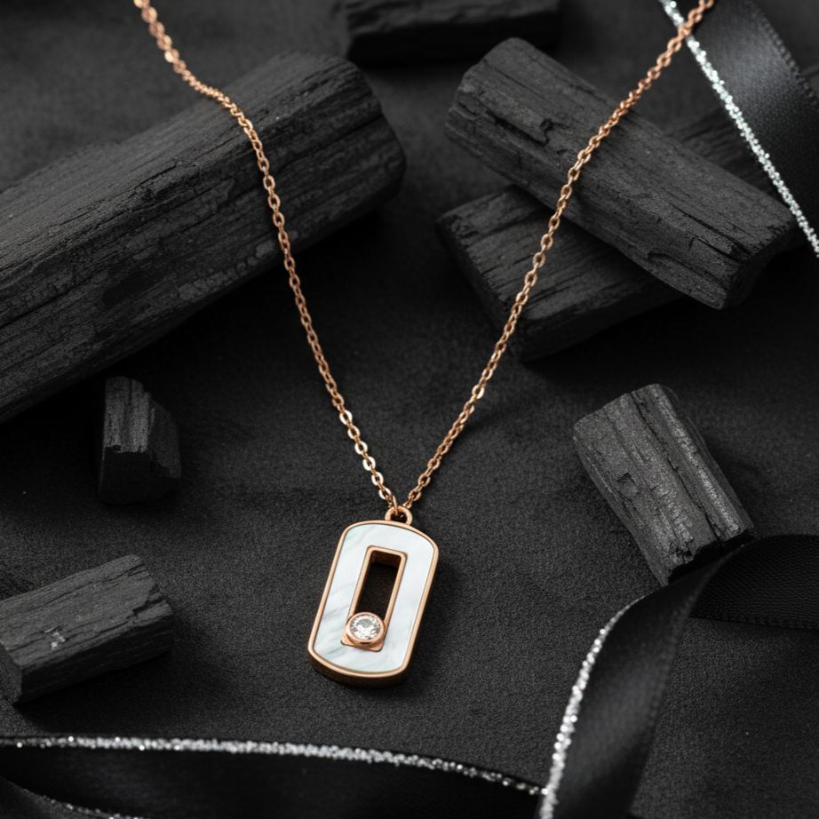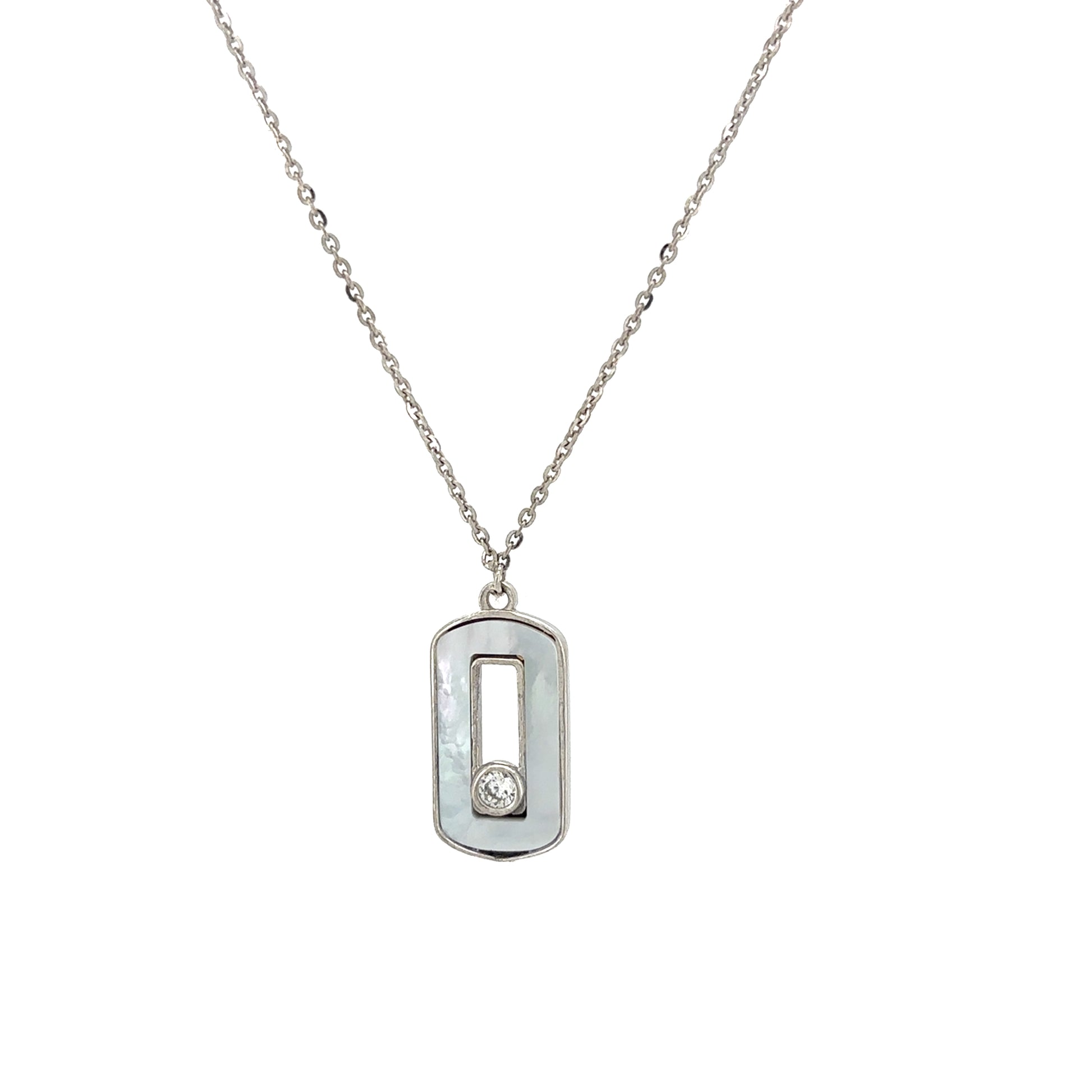 This elegant necklace features a sleek, rectangular pendant with a beautiful Mother of Pearl inlay. A single, brilliant zircon is set in the center, adding a subtle touch of sparkle that beautifully complements the iridescent sheen of the pearl. The pendant hangs from a delicate link chain, creating a perfectly balanced and polished look.