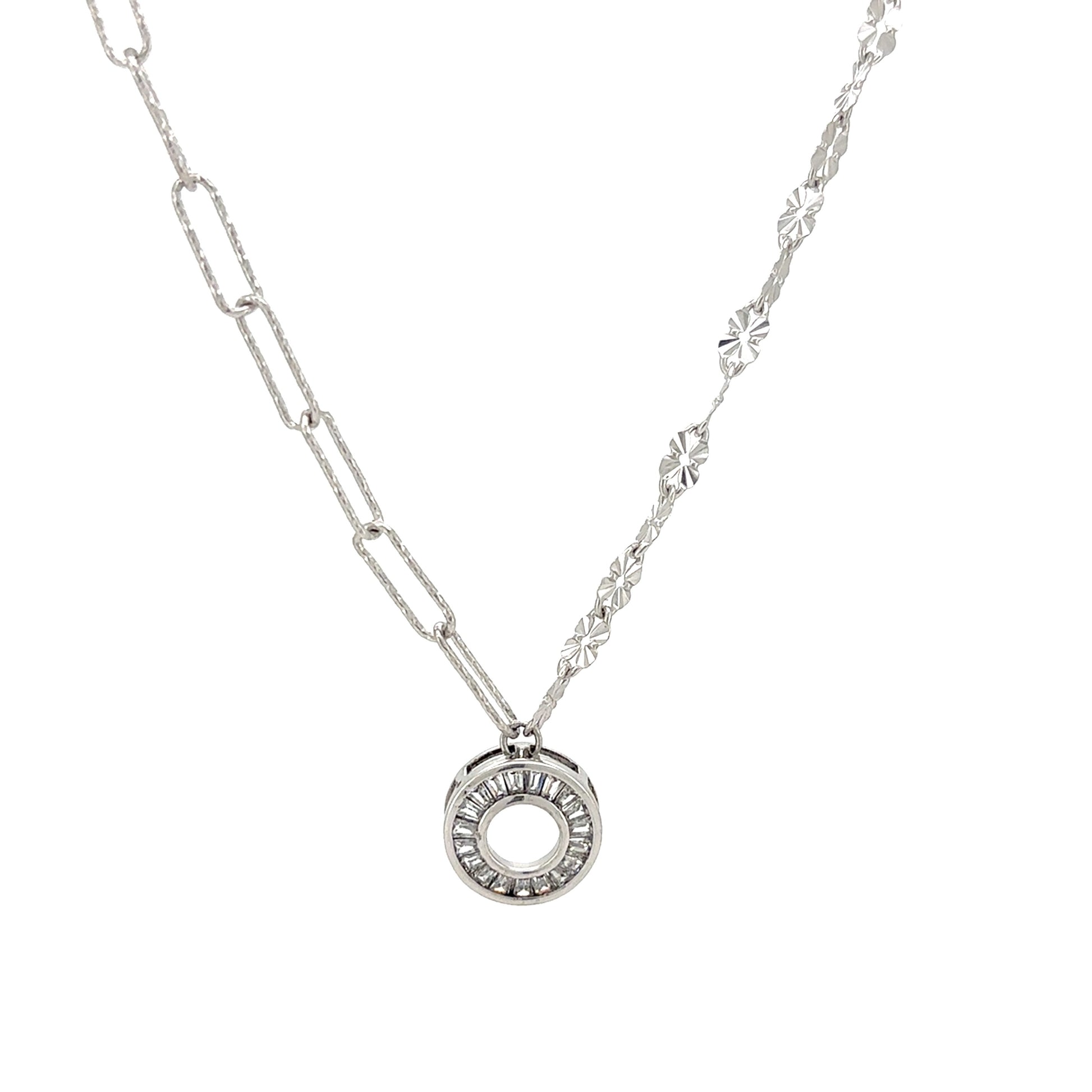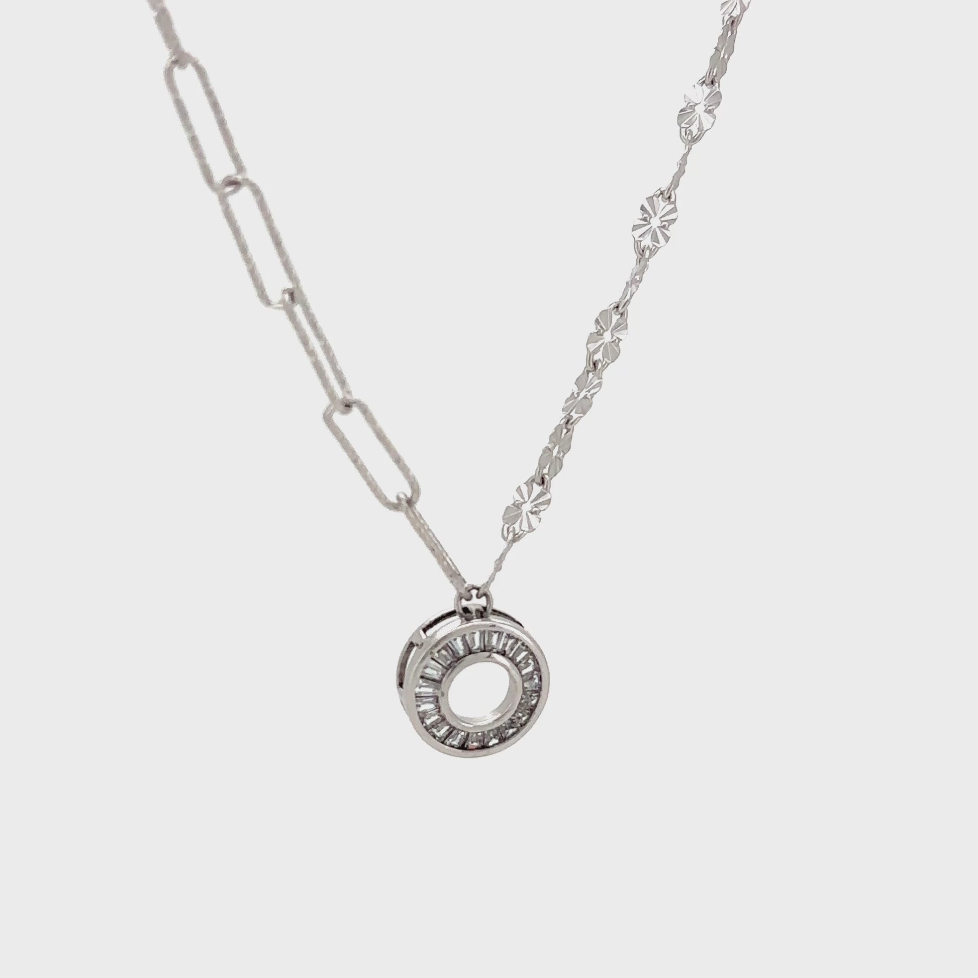 This sophisticated necklace features a lightweight, circle-shaped pendant that is brilliantly unique. The pendant is studded with sparkling zircons that are arranged in a dynamic pattern, creating a captivating display of light. The design is further elevated by its distinctive dual-style chain, with one side featuring delicate, faceted links and the other a paperclip chain, adding to its modern and artistic charm.