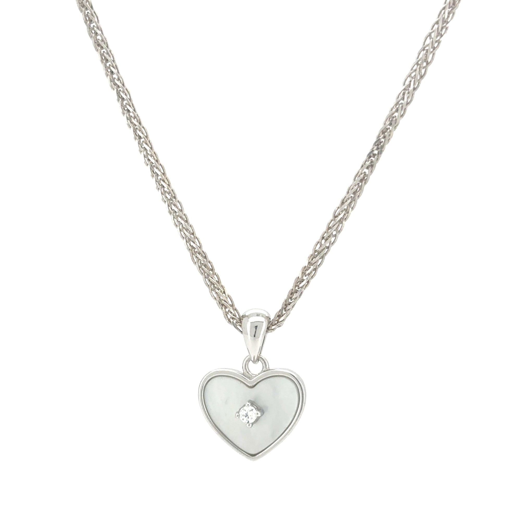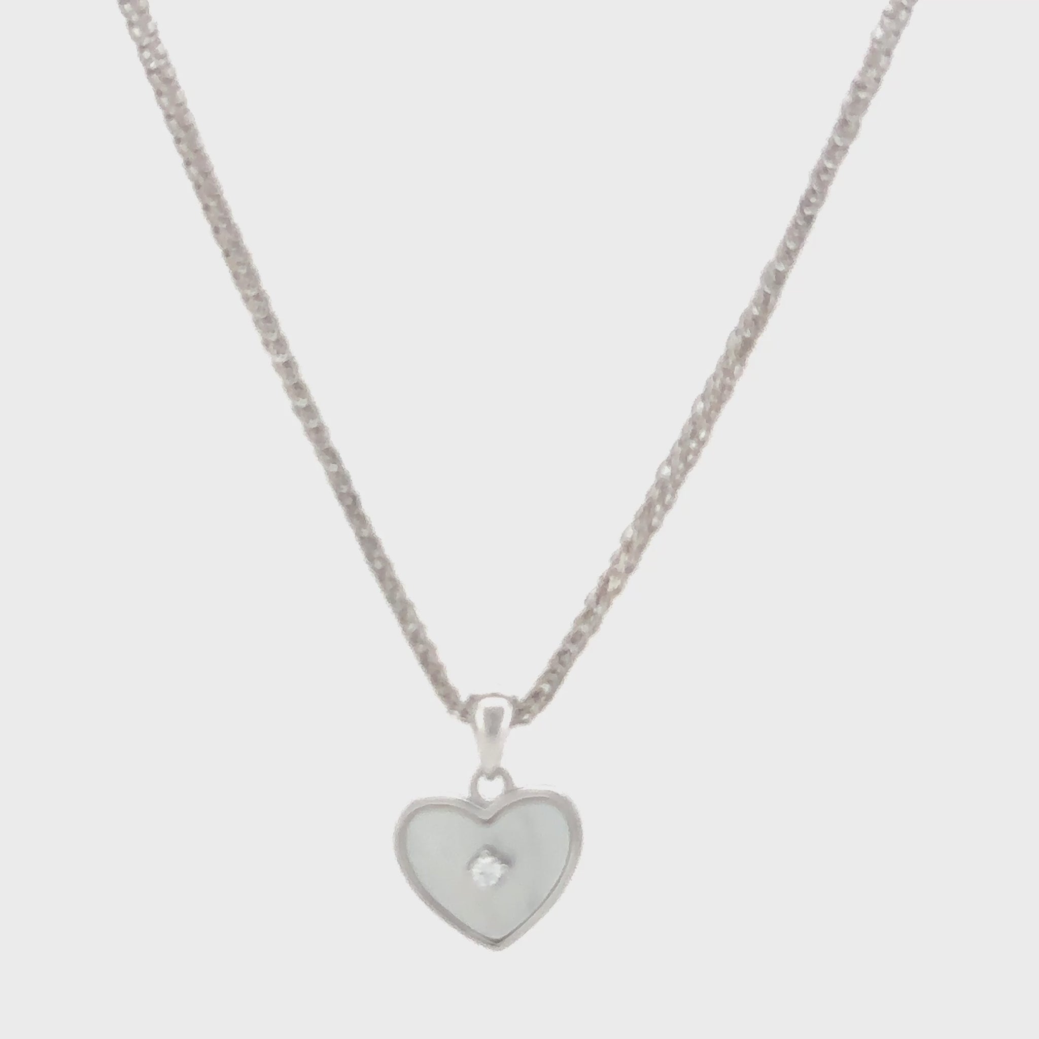 This elegant silver necklace features a classic heart-shaped pendant. The heart is gracefully filled with a smooth, radiant Mother of Pearl, which provides a soft, iridescent luster. A single, sparkling zircon is set on the surface of the heart, adding a delicate touch of brilliance to the design. The timeless pendant hangs from a delicate chain, completing a look that is both romantic and refined.