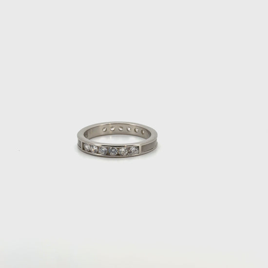 This elegant silver band features a sophisticated channel setting along its upper half, showcasing a continuous line of brilliant round-cut zircons. The clean, modern design emphasizes the continuous sparkle, symbolizing eternal grace and subtle luxury. The smooth, polished silver band provides a comfortable fit and a versatile look.