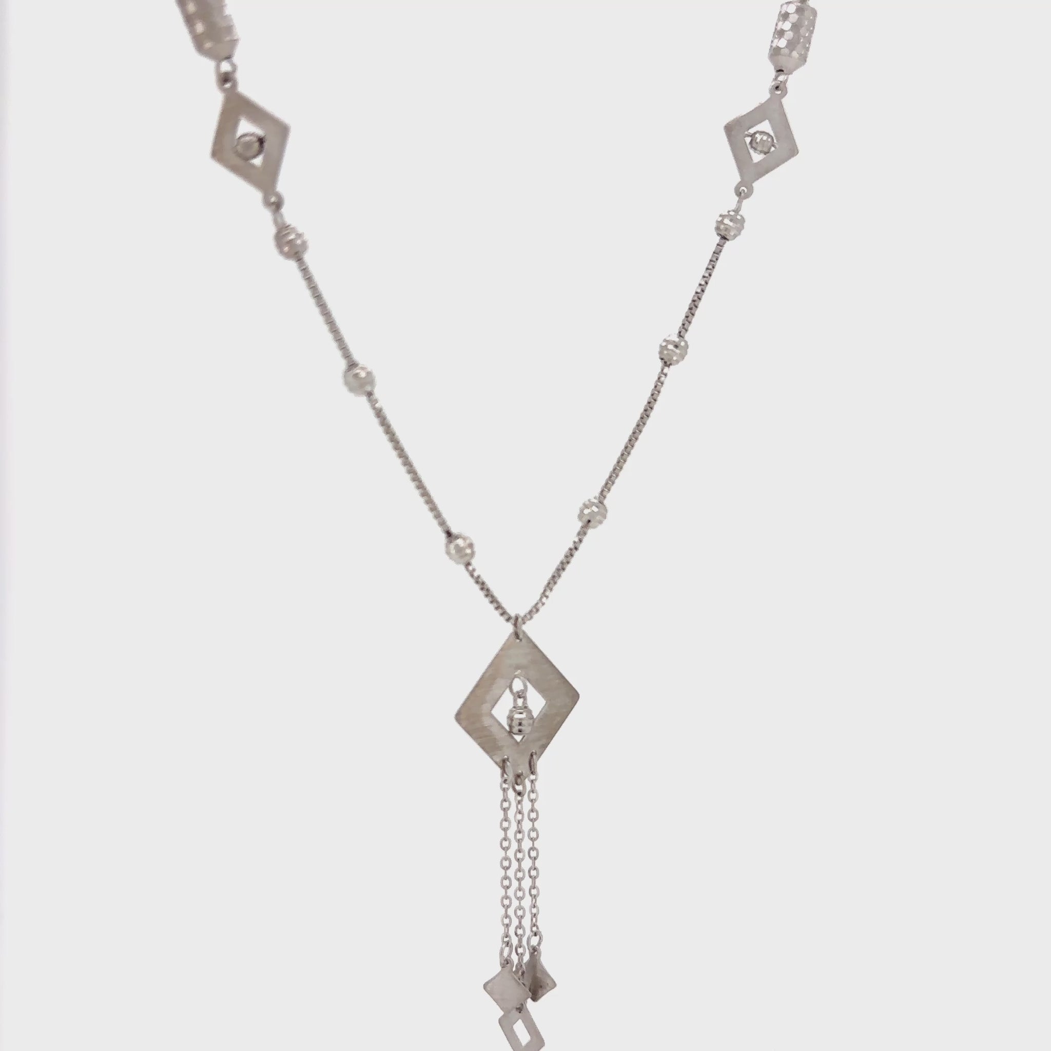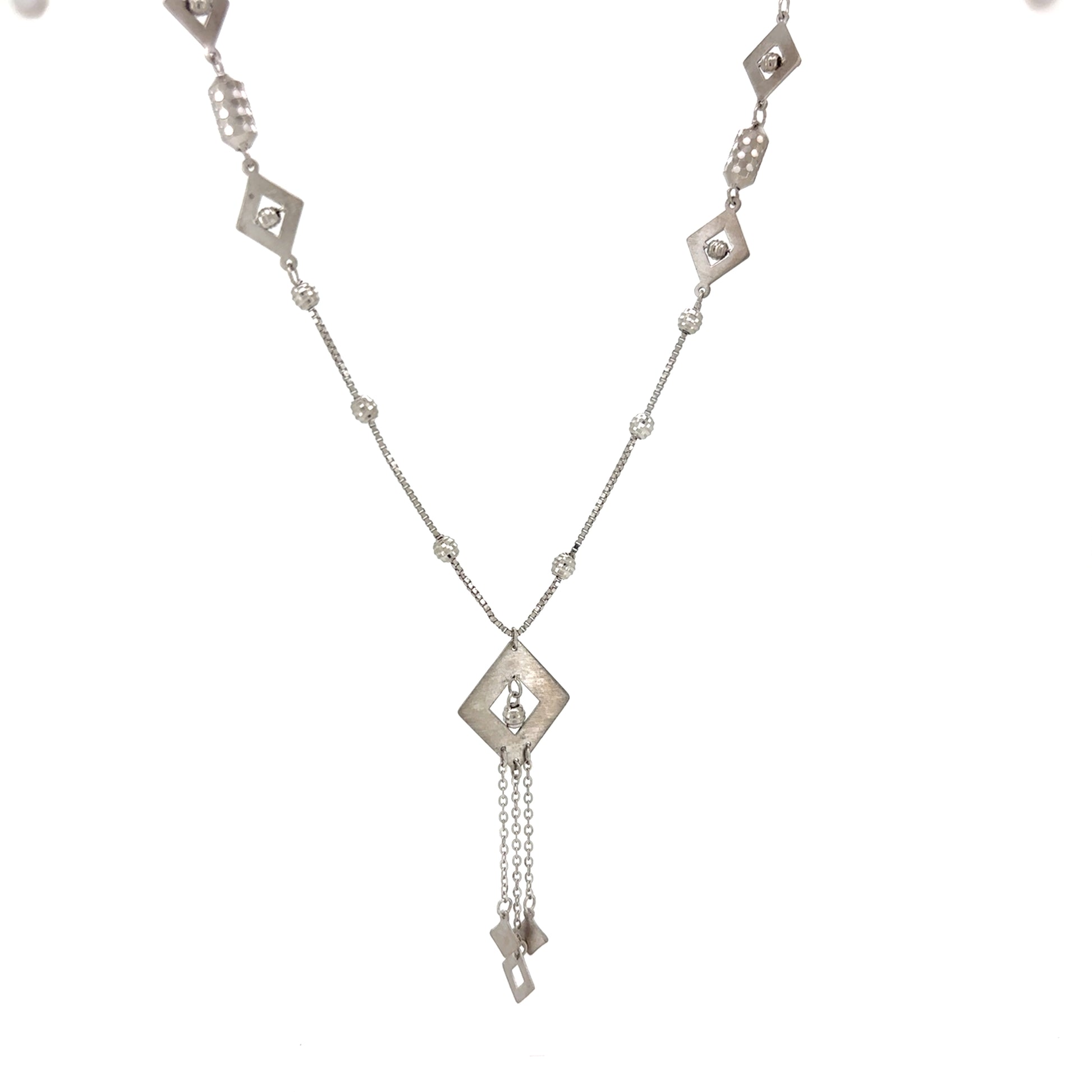 This intricate necklace features a chain adorned with a variety of beautiful elements. It includes a series of small, polished silver balls and distinct links shaped like small rhombus or triangles with a unique texture. The centerpiece is a medium-sized triangular pendant, from which hangs a series of graceful dangles, each finished with a smaller triangle. The combination of shapes and textures creates a truly captivating and artistic look