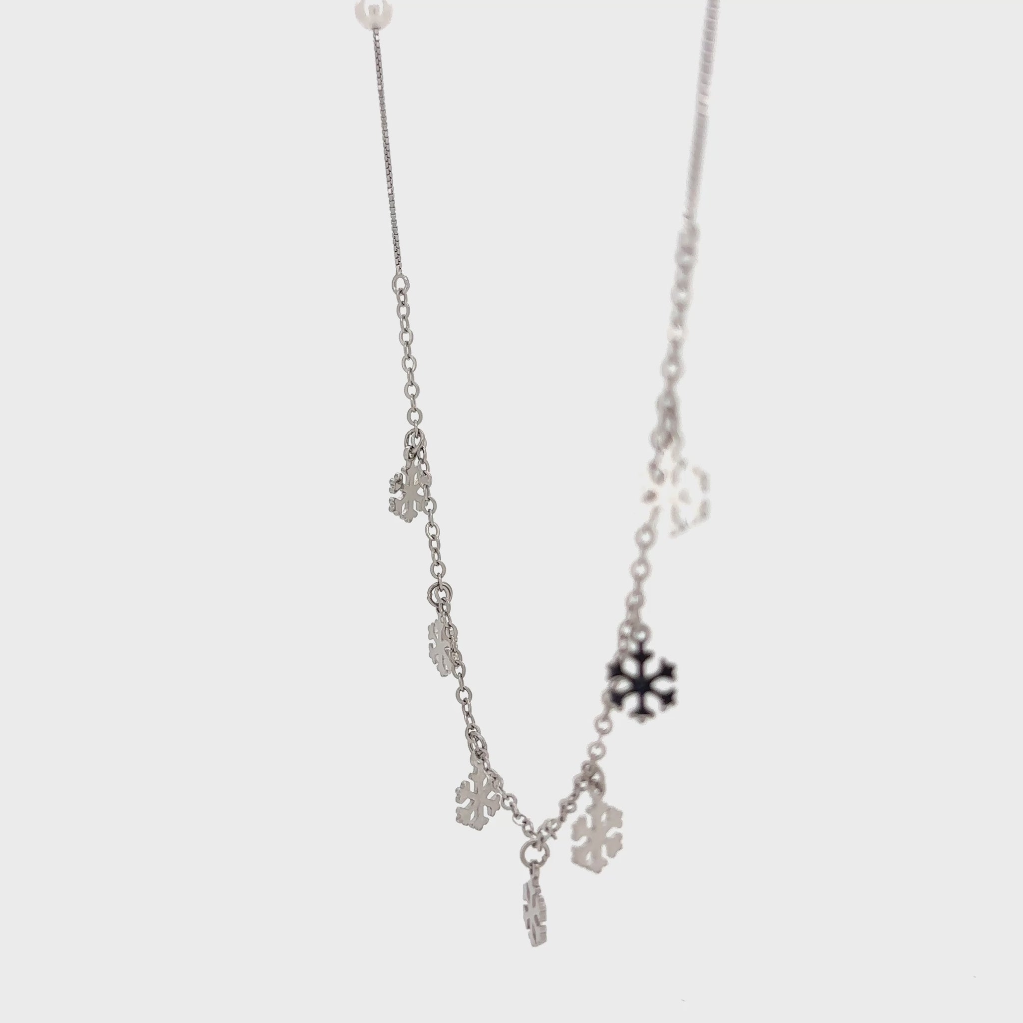 This elegant necklace features a beautiful, multi-element design. The fine chain is adorned with two translucent, square-shaped beads and two delicate, polished pearls. The centerpiece is a beautiful cascade of dangling, polished snowflake charms that create a stunning fringe effect, catching the light with every movement.