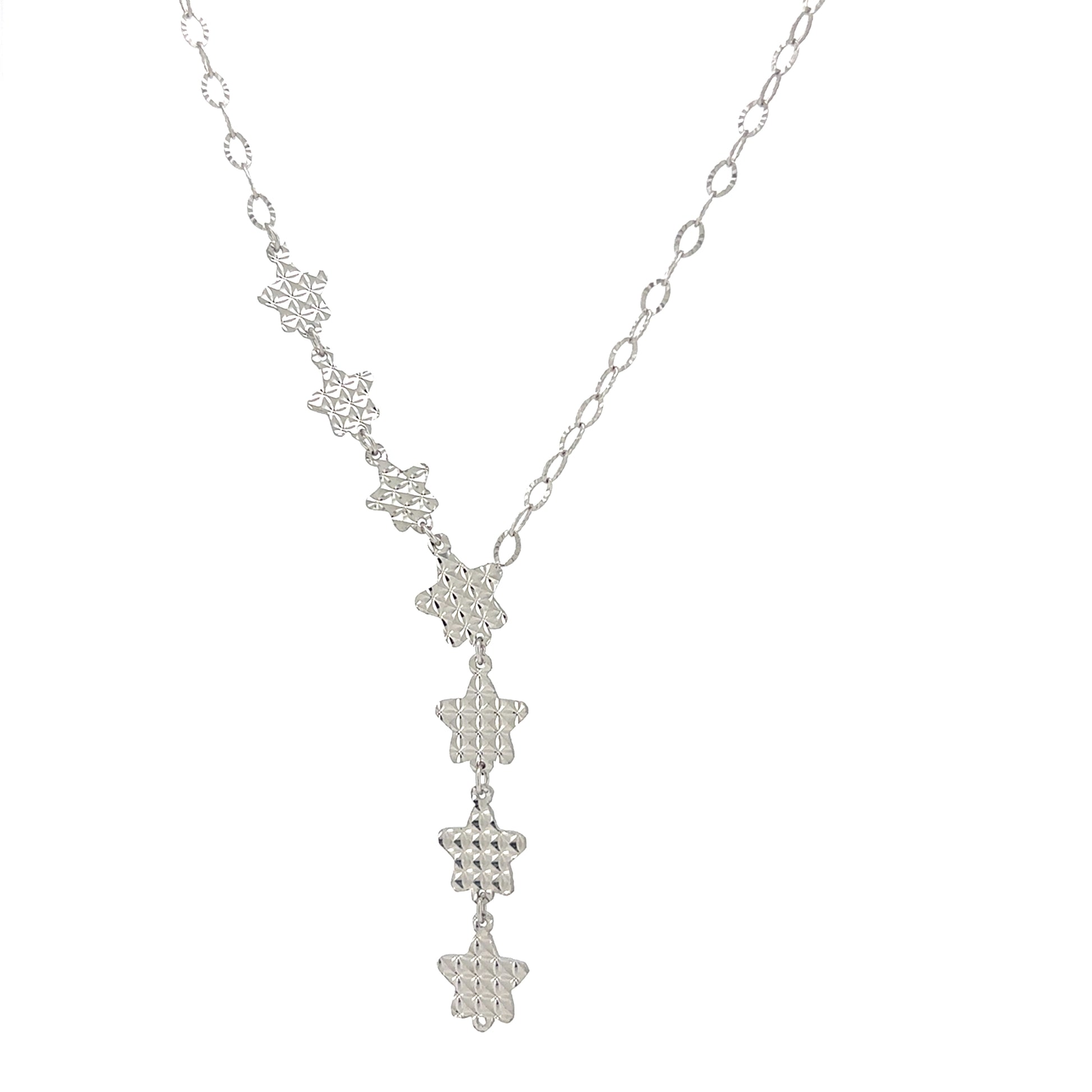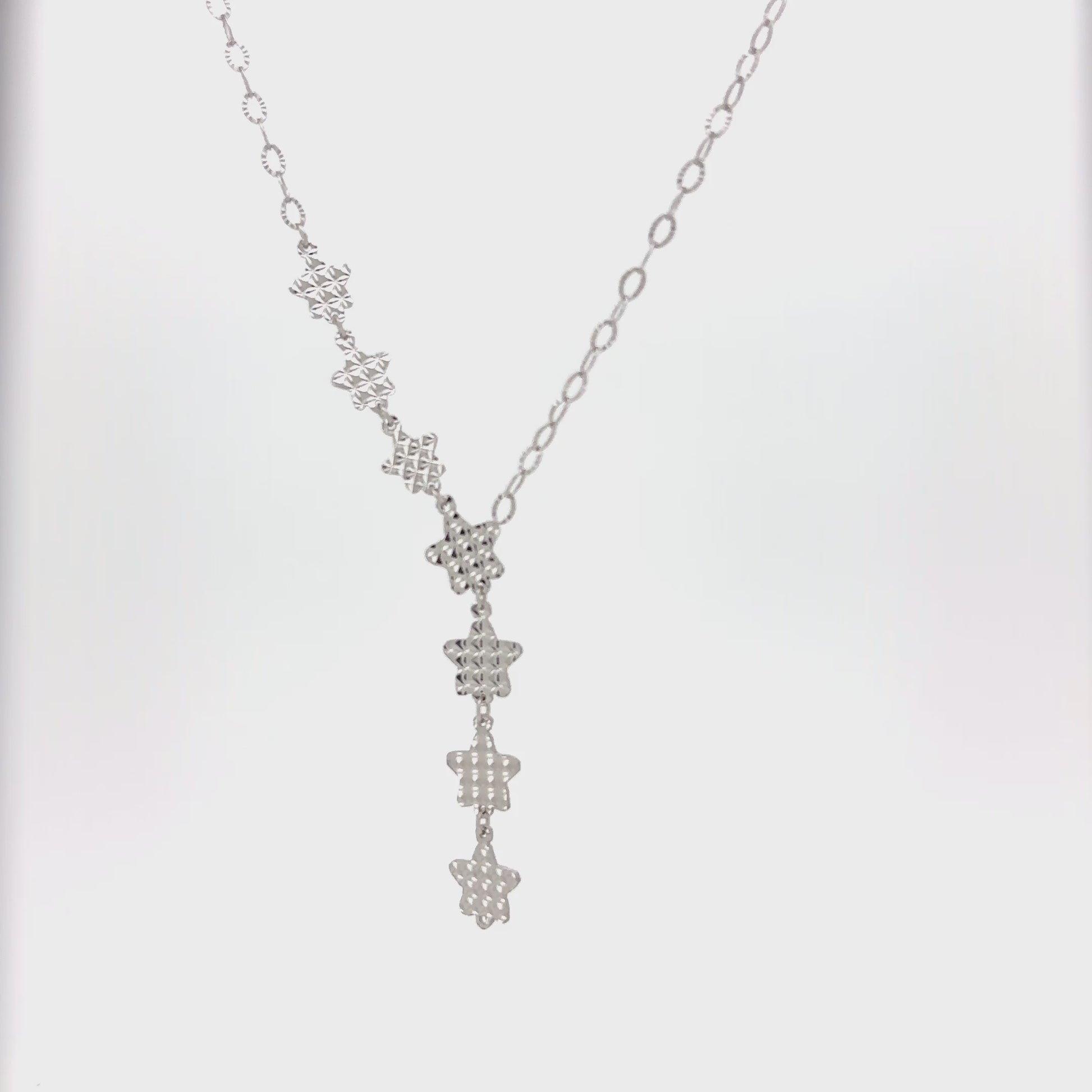 This elegant silver lariat-style necklace features a delicate chain that descends to form a graceful drop. A series of six beautifully crafted stars, each with a detailed, textured surface that catches the light, are arranged along the drop, creating a shimmering cascade.