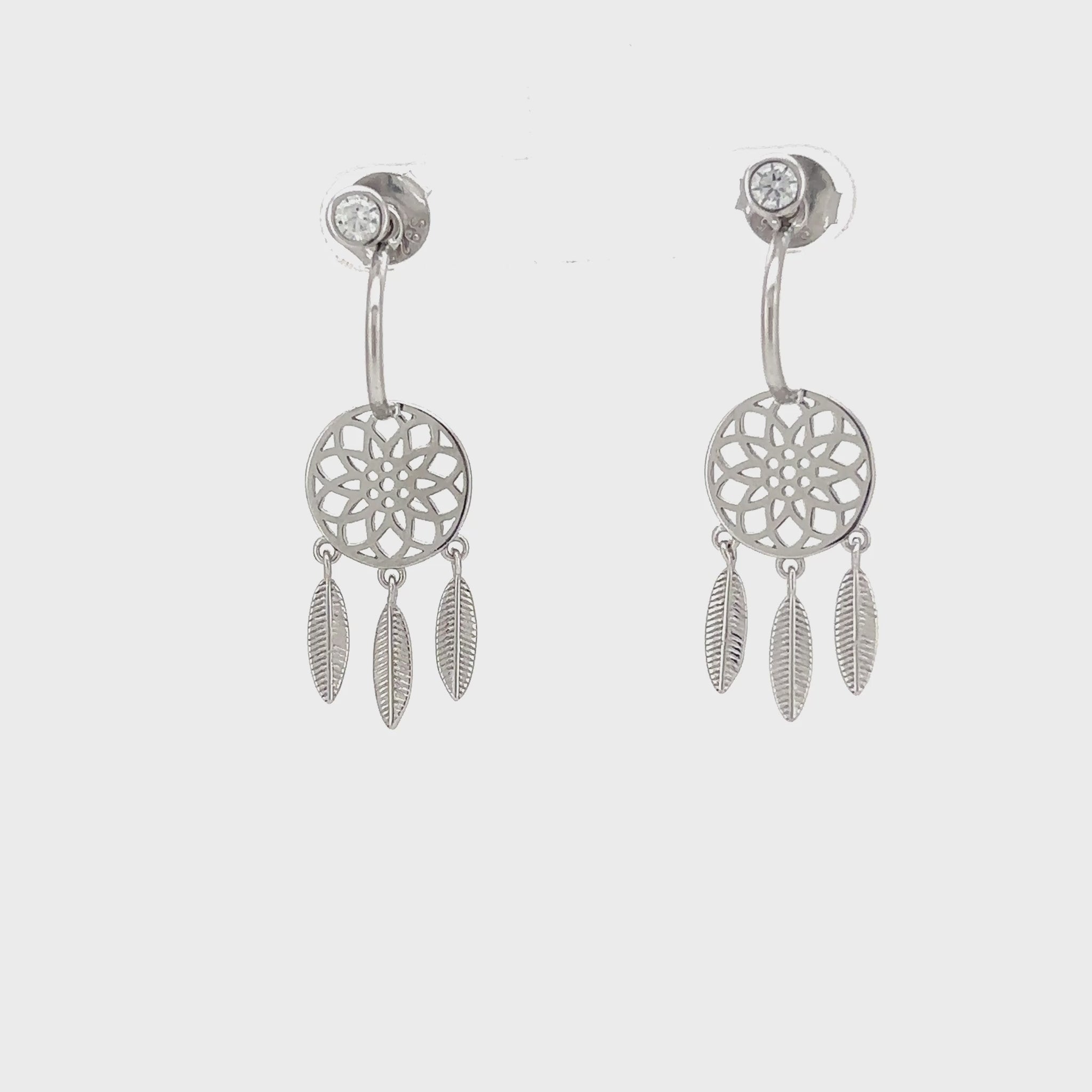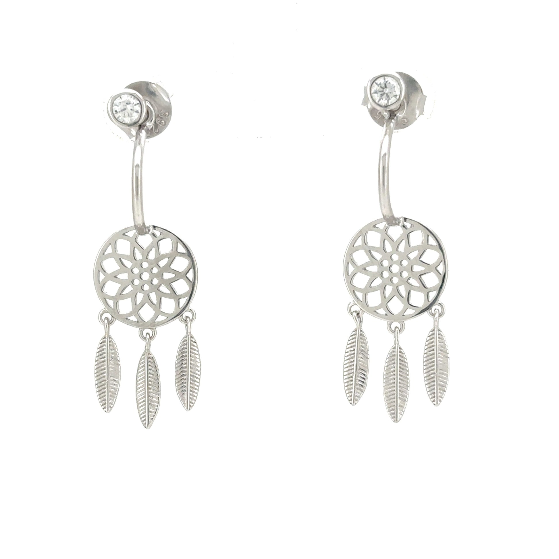 Adorn your ears with the enchanting spirit of our Whispering Dreams Drop Earrings. Expertly crafted from 925 Sterling Silver, each earring begins with a sparkling round solitaire stud, from which a graceful curve descends. This leads to an intricate, openwork circular motif featuring a delicate floral pattern, reminiscent of a woven web. From this, three exquisitely detailed silver feathers gently dangle, catching the light with every movement.
