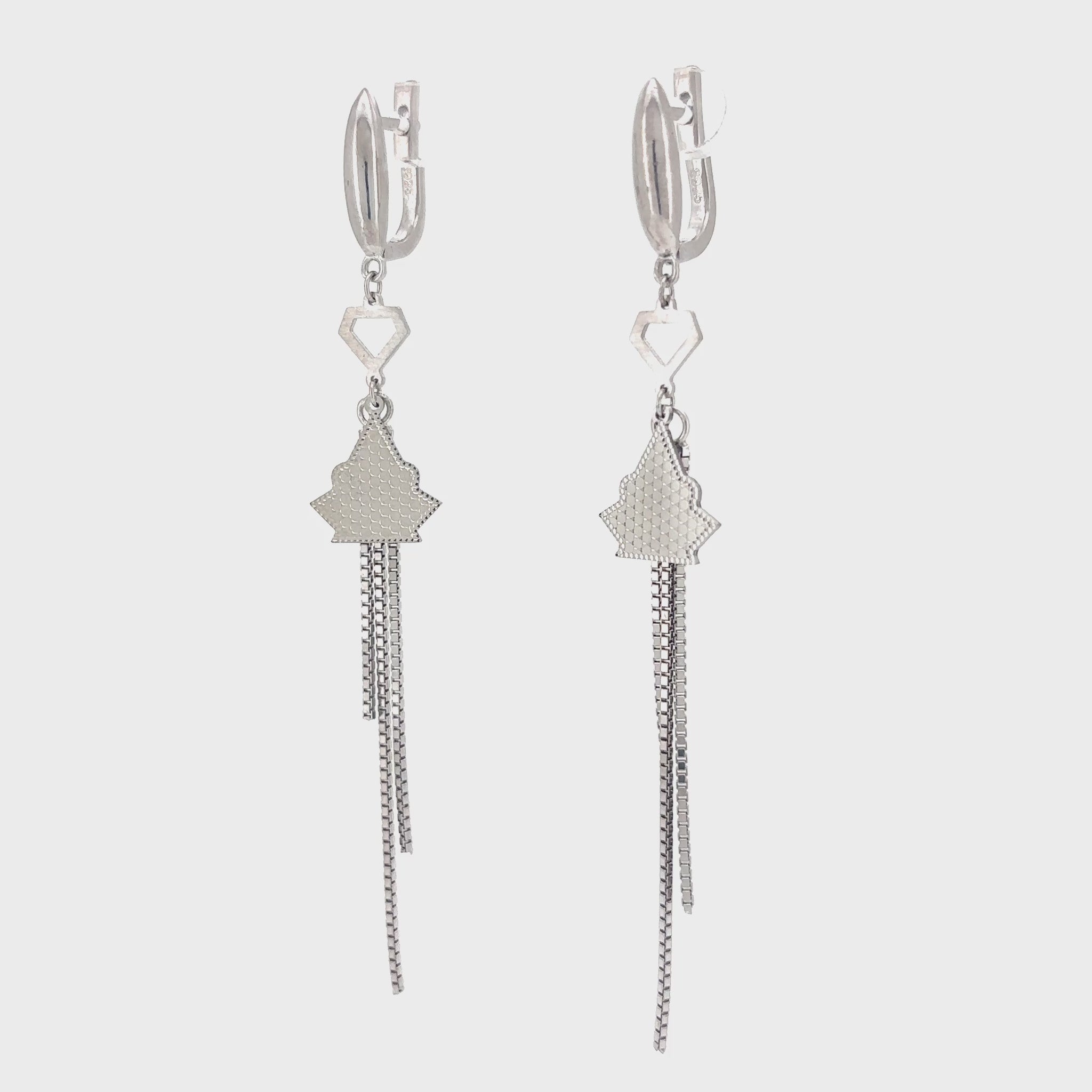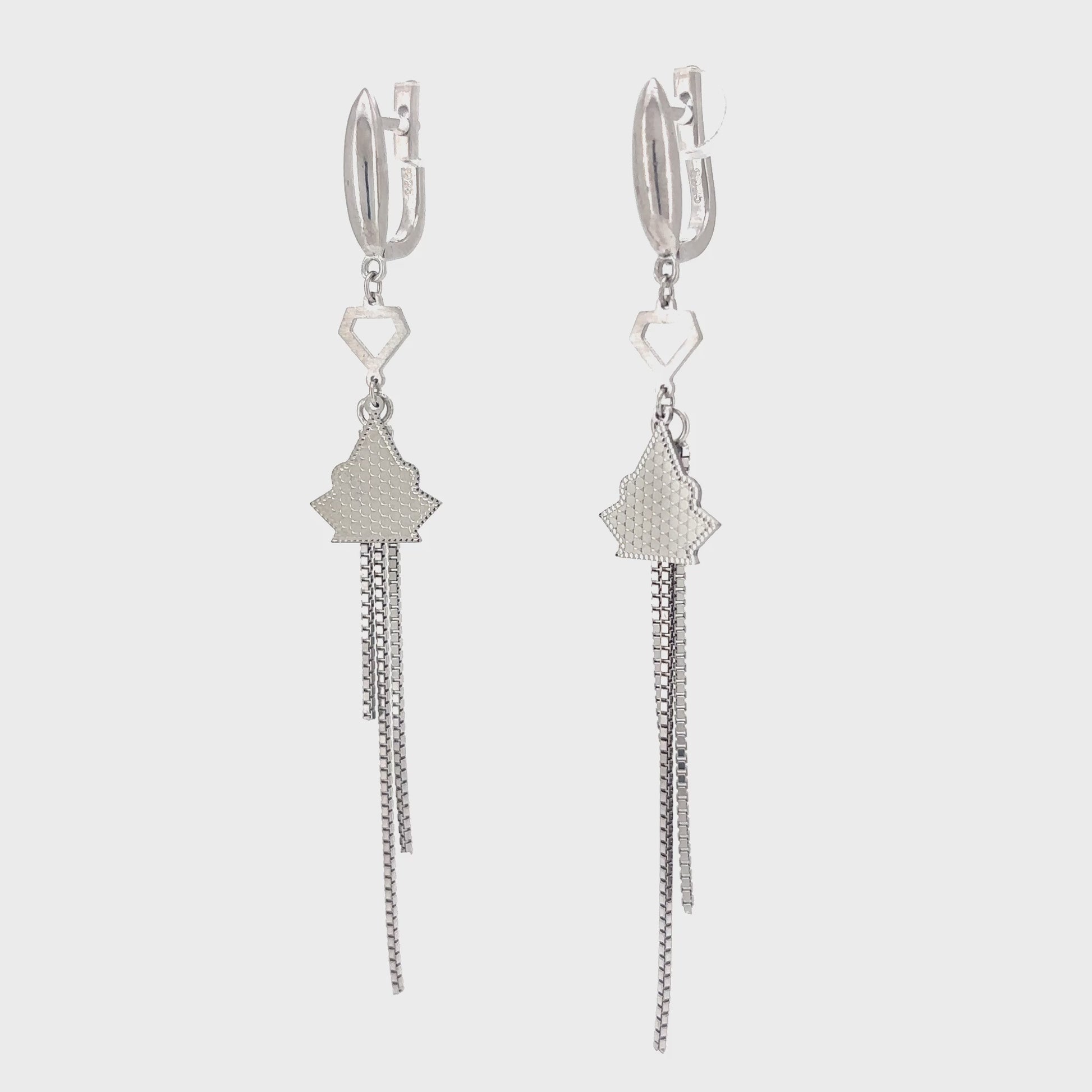 Adorn your ears with the festive charm of our Winter Radiance Drop Earrings. Expertly crafted from 925 Sterling Silver, these sophisticated earrings feature a secure lever-back closure for comfort. A polished, elongated hexagon links to a subtly textured, abstract tree-like motif, creating a modern and celebratory silhouette. From the base of this elegant shape, multiple strands of delicate silver chain gracefully cascade, shimmering with every movement, reminiscent of falling snow or twinkling lights.